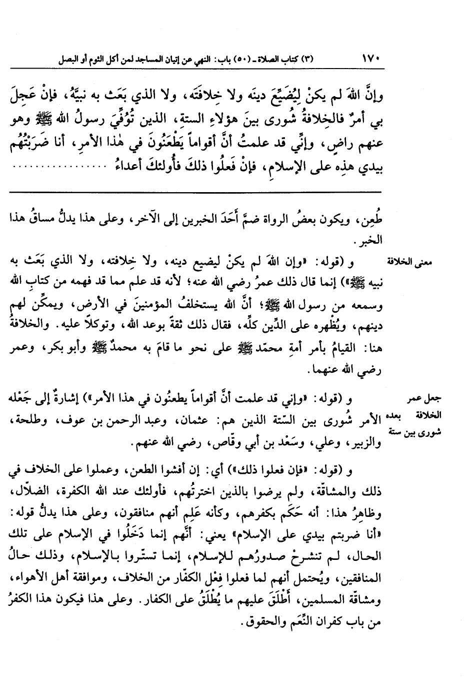 وَإِنَّ اللَّهَ لَم يَكُن لِيُضَيِّعَ دِينَهُ وَلا خِلافَتَهُ، وَلا الَّذِي بَعَثَ بِهِ نَبِيَّهُ، فَإِن عَجِلَ بِي أَمرٌ فَالخِلافَةُ شُورَى بَينَ هَؤُلاءِ السِّتَّةِ الَّذِينَ تُوُفِّيَ رَسُولُ اللَّهِ - صلى الله عليه وسلم - وَهُوَ عَنهُم رَاضٍ، وَإِنِّي قَد عَلِمتُ أَنَّ أَقوَامًا يَطعَنُونَ فِي هَذَا الأَمرِ، أَنَا ضَرَبت هُم بِيَدِي هَذِهِ عَلَى الإِسلامِ، فَإِن فَعَلُوا ذَلِكَ فَأُولَئِكَ أَعدَاءُ