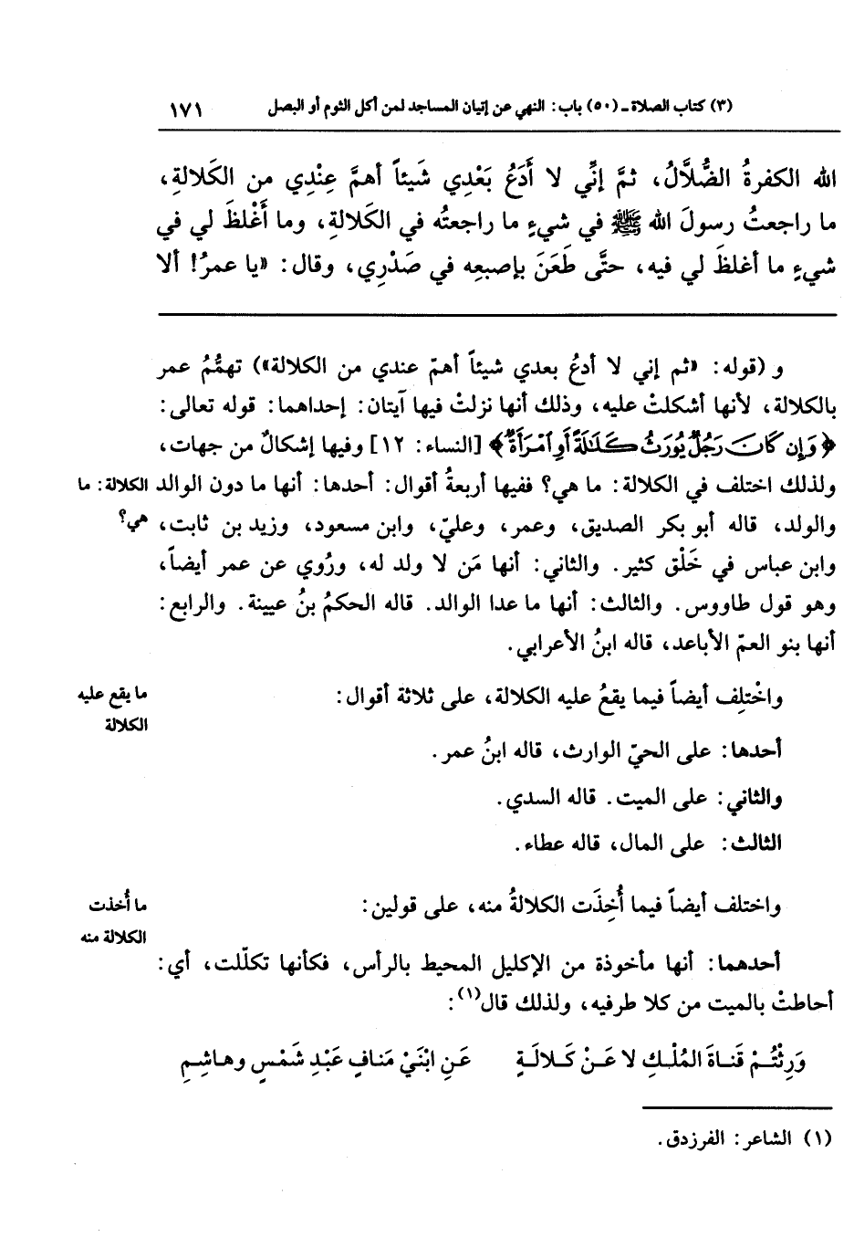 اللَّهِ الكَفَرَةُ الضُّلالُ، ثُمَّ إِنِّي لا أَدَعُ بَعدِي شَيئًا أَهَمَّ عِندِي مِنَ الكَلالَةِ، مَا رَاجَعتُ رَسُولَ اللَّهِ - صلى الله عليه وسلم - فِي شَيءٍ مَا رَاجَعتُهُ فِي الكَلالَةِ، وَمَا أَغلَظَ لِي فِي شَيءٍ مَا أَغلَظَ لِي فِيهِ، حَتَّى طَعَنَ بِإِصبَعِهِ فِي صَدرِي، وقَالَ: يَا عُمَرُ! أَلا