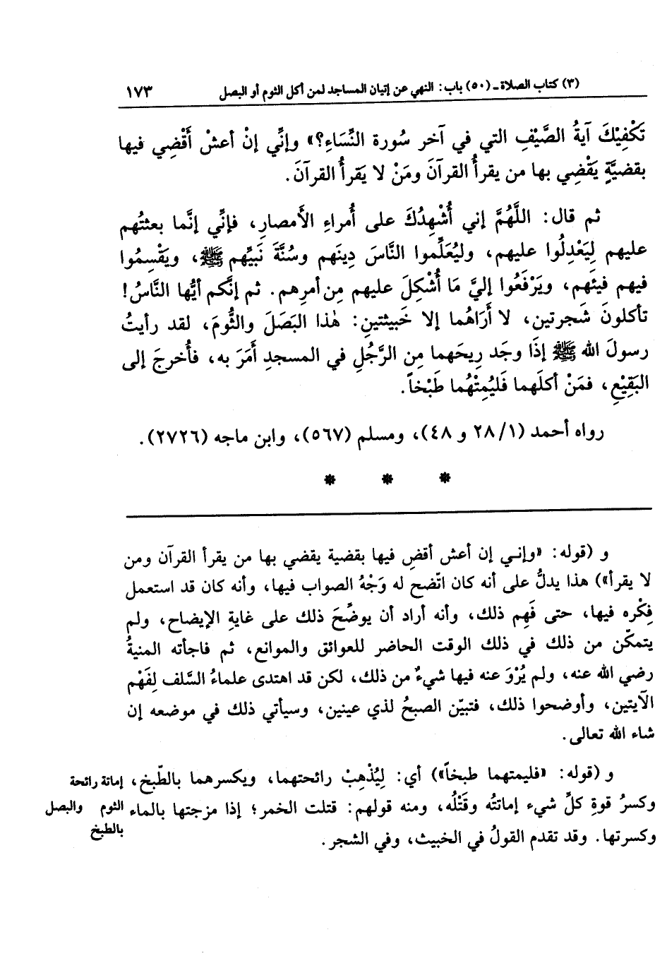 ثُمَّ قَالَ: اللَّهُمَّ إِنِّي أُشهِدُكَ عَلَى أُمَرَاءِ الأَمصَارِ، فَإِنِّي إِنَّمَا بَعَثتُهُم عَلَيهِم لِيَعدِلُوا عَلَيهِم، وَلِيُعَلِّمُوا النَّاسَ دِينَهُم وَسُنَّةَ نَبِيِّهِم - صلى الله عليه وسلم -، وَيَقسِمُوا فِيهِم فَيئَهُم، وَيَرفَعُوا إِلَيَّ مَا أَشكَلَ عَلَيهِم مِن أَمرِهِم. ثُمَّ إِنَّكُم أَيُّهَا النَّاسُ! تَأكُلُونَ شَجَرَتَينِ لا أَرَاهُمَا إِلا خَبِيثَتَينِ: هَذَا البَصَلَ وَالثُّومَ، لَقَد رَأَيتُ رَسُولَ اللَّهِ - صلى الله عليه وسلم - إِذَا وَجَدَ رِيحَهُمَا مِنَ الرَّجُلِ فِي المَسجِدِ أَمَرَ بِهِ، فَأُخرِجَ إِلَى البَقِيعِ، فَمَن أَكَلَهُمَا فَليُمِتهُمَا طَبخًا.