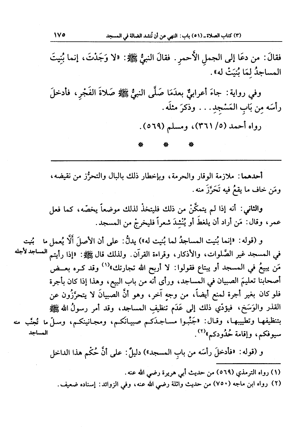 فَقَالَ: مَن دَعَا إِلَى الجَمَلِ الأَحمَرِ. فَقَالَ النَّبِيُّ - صلى الله عليه وسلم -: لا وَجَدتَ، إِنَّمَا بُنِيَتِ المَسَاجِدُ لِمَا بُنِيَت لَهُ.