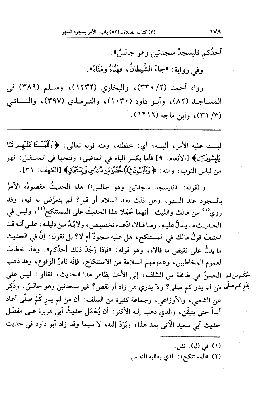وقوله: فليسجد سجدتين وهو جالس، هذا الحديث مقصوده الأمر بالسجود عند السهو، وهل ذلك بعد السلام، أو قبل؟ لم يتعرض له فيه، وقد رُوي (¬1) عن مالك والليث: أنهما حملا هذا الحديث على المُستَنكِح (¬2)، وليس في الحديث ما يدل عليه، وما قالاه ادعاء تخصيص، ولا بد من دليله، على أنه قد اختلف قول مالك في المستنكح، هل عليه سجود أم لا؟ بل نقول: إن في الحديث ما يدل على نقيض ما قالاه، وهو قوله: فإذا وجد ذلك أحدكم، وهذا خطاب لعموم المخاطبين، وعمومهم السلامة من الاستنكاح، فإنه نادر الوقوع، وقد ذهب الحسن في طائفة من السلف، إلى الأخذ بظاهر هذا الحديث، فقالوا: ليس على من لم يَدرِ كَم صلى، ولا يدري هل زاد أو نقص غير سجدتين وهو جالس. وذُكر عن الشعبي والأوزاعي وجماعة كثيرة من السلف: أن من لم يدر كم صلى أعاد أبدًا حتى يتيقن، والذي ذهب إليه الأكثر: أن يحمل حديث أبي هريرة على مفصَّل حديث أبي سعيد الآتي بعد هذا، ويُرَدّ إليه، لا سيما وقد زاد أبو داود في حديث
