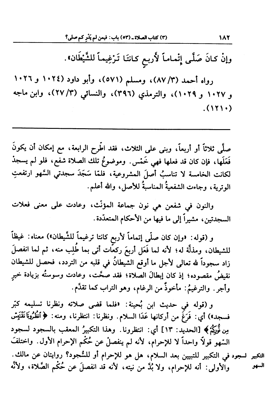 وقوله: وإن كان صلى إتمامًا لأربع كانتا ترغيمًا للشيطان؛ معناه: غيظًا للشيطان، ومذلّة له؛ لأنه لما فعل أربع ركعات أتى بما طلب منه، ثم لما انفصل زاد سجودًا لله تعالى؛ لأجل ما أوقع الشيطان في قلبه من التردد، فحصل للشيطان نقيض مقصوده؛ إذ كان إبطال الصلاة، فقد صحت، وعادت وسوسته بزيادة خير وأجر. والترغيم: مأخوذ من الرَّغَام؛ وهو التراب كما تقدم.