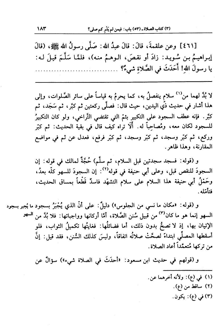 [461]- وَعَن عَلقَمَةَ قَالَ: قَالَ عبد الله: صَلَّى رَسُولُ اللَّهِ - صلى الله عليه وسلم (قَالَ إِبرَاهِيمُ بنُ سُوَيدٍ: زَادَ أَو نَقَصَ، الوَهمُ مِنهُ) فَلَمَّا سَلَّمَ قِيلَ لَهُ: يَا رَسُولَ اللَّهِ! أَحَدَثَ فِي الصَّلاةِ شَيءٌ؟