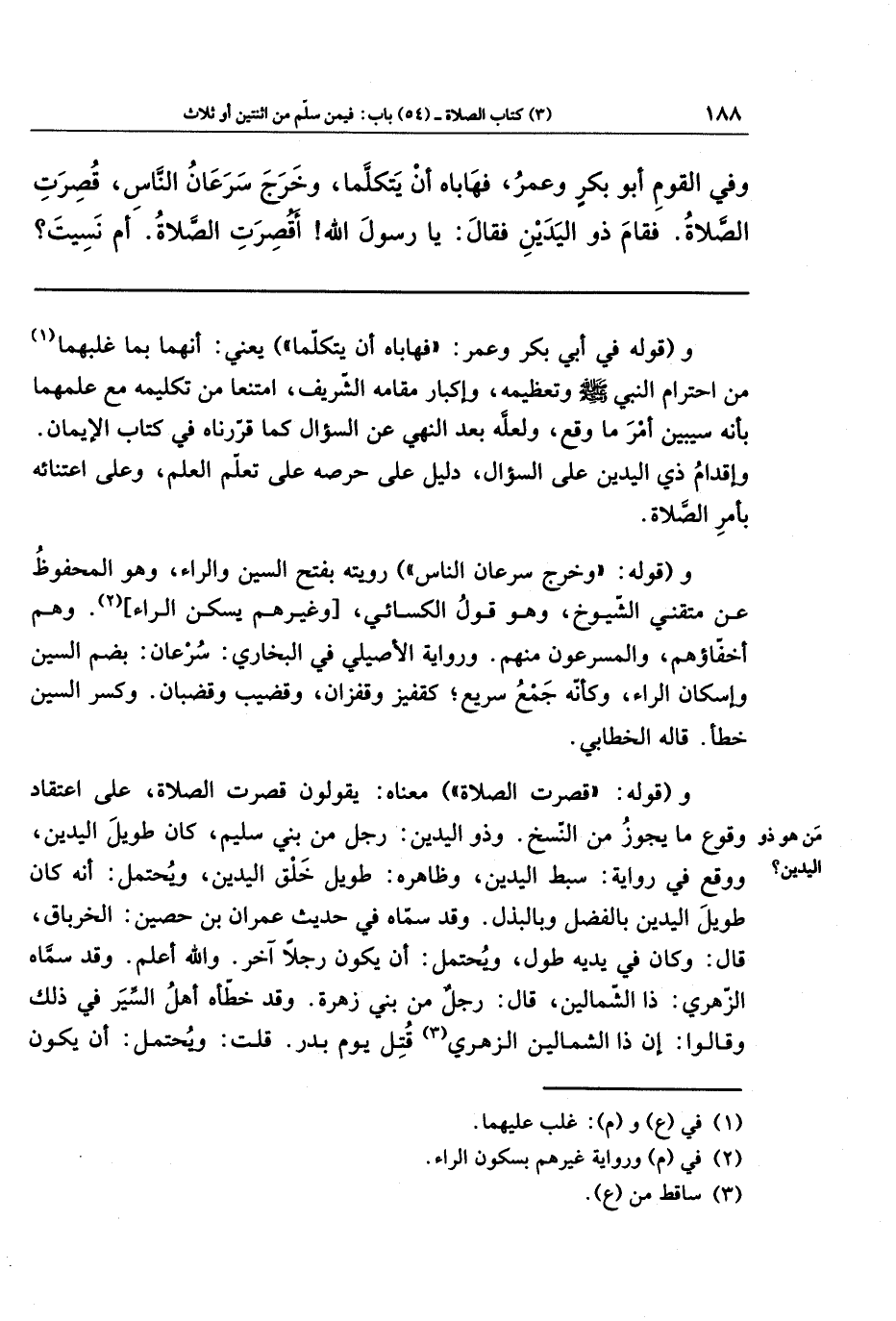 وقوله: قصرت الصلاة؟ معناه: يقولون: قصرت الصلاة، على اعتقاد وقوع ما يجوز من النسخ. وذو اليدين: رجل من بني سُليم، كان طويل اليدين. ووقع في رواية: بسيط اليدين، وظاهره: طويل خلق اليدين، ويحتمل أنه كان طويل اليدين بالفضل وبالبذل. وقد سماه في حديث عمران بن حصين: الخِرباق، قال: وكان في يديه طول، ويحتمل أن يكون رجلا آخر، والله أعلم. وقد سماه الزهري: ذا الشمالين، قال: رجل من بني زُهرة، وقد خطّأه أهل السِّيَر في ذلك، وقالوا: إن ذا الشمالين الزهري (¬3) قتل يوم بدر. قلت: ويحتمل أن يكون