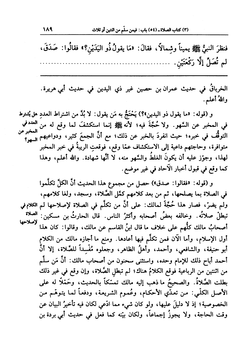 وقوله: فقالوا: صدق؛ حصل من مجموع هذا الحديث أن الكلّ تكلموا في الصلاة بما يصلحها، ثم من بعد كلامهم كمّل الصلاة، وسجد، ولَغَا كلامهم، ولم يضرّ، فصار هذا حجة لمالك على أن من تكلم في الصلاة لإصلاحها لم تبطل صلاته، وخالفه بعض أصحابه وأكثر الناس. قال الحارث بن مسكين: أصحاب مالك كلهم على خلاف ما قال ابن القاسم عن مالك، وقالوا: كان هذا أول الإسلام، وأما الآن فمن تكلم فيها أعادها، ومنع ما أجازه مالك من الكلام: أبو حنيفة، والشافعي، وأحمد، وأهل الظاهر، وجعلوه مفسدًا للصلاة، إلا أن أحمد أباح ذلك للإمام وحده، واستثنى سحنون - من أصحاب مالك - أن من سَلّم من اثنتين من الرباعية، فوقع الكلام هناك لم تبطل الصلاة، وإن وقع في غير ذلك بطلت الصلاة. والصحيح ما ذهب إليه مالك تمسكًا بالحديث، وحملا له على الأصل الكلي؛ من تعدّي الأحكام، وعموم الشريعة، ودفعًا لما يُتوهم من الخصوصية؛ إذ لا دليل عليها، ولو كان شيء مما ادعي؛ لكان فيه تأخير البيان عن وقت الحاجة، ولا يجوز إجماعًا، ولكان بيّنه؛ كما فعل في حديث أبي بردة بن