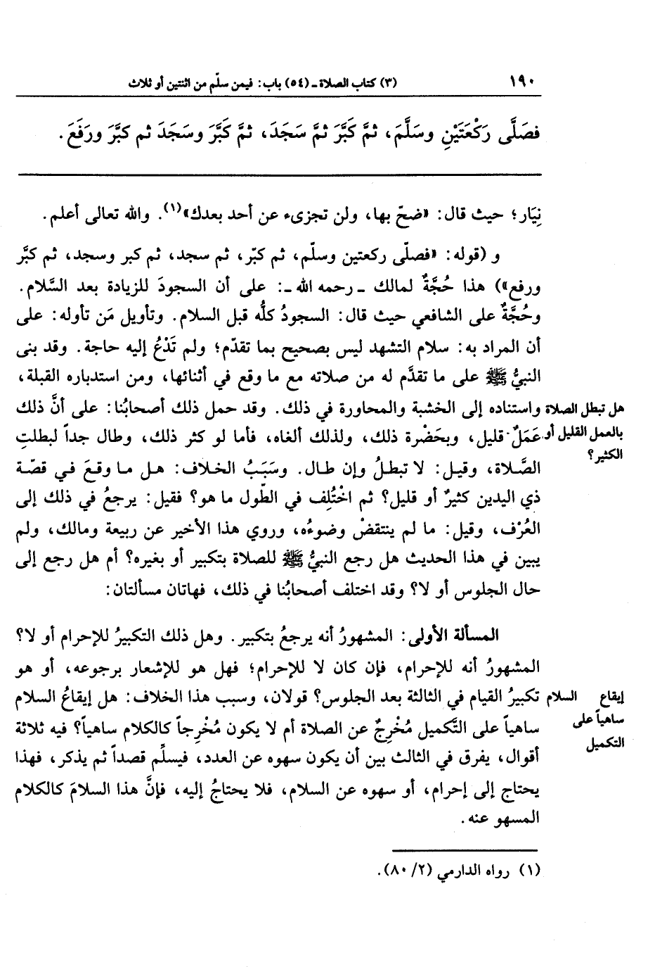 المسألة الأولى: المشهور أنه يرجع بتكبير. وهل ذلك التكبير للإحرام، أو لا؟ المشهور أنه للإحرام، فإن كان لا للإحرام، فهل هو للإشعار برجوعه، أو هو تكبير القيام في الثالثة بعد الجلوس؟ قولان. وسبب هذا الخلاف: هل إيقاع السلام ساهيًا على التكميل مخرج عن الصلاة، أم لا يكون مخرجًا؛ كالكلام ساهيًا؟ فيه ثلاثة أقوال: يفرّق في الثالث بين أن يكون سهوه عن العدد، فيسلم قصدًا، ثم يذكر، فهذا يحتاج إلى إحرام، أو سهوه عن السلام، فلا يحتاج إليه، فإن هذا السلام كالكلام المسهو عنه.