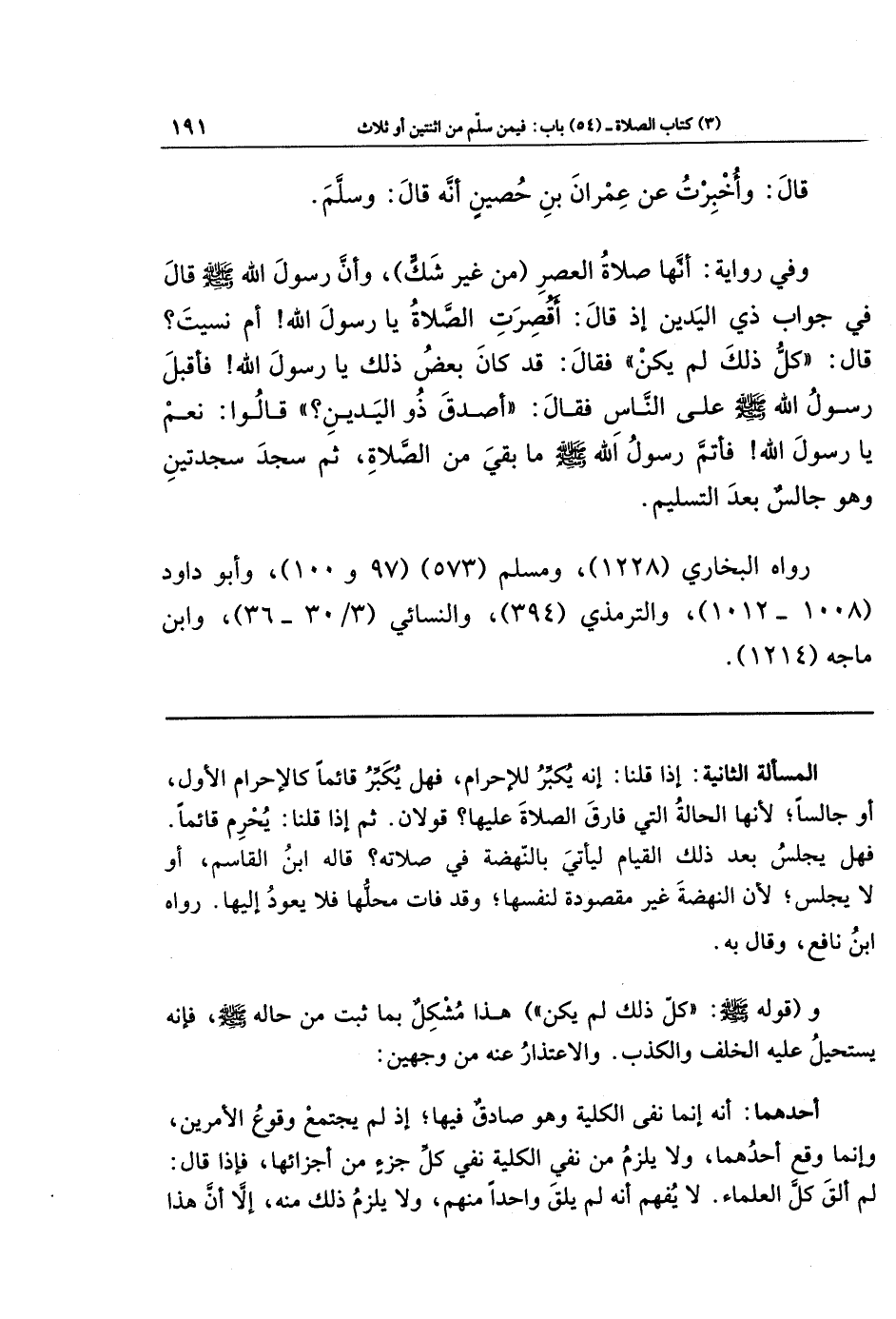 وَفِي رِوَايَة: أَنَّهَا صَلاةَ العَصرِ (مِن غَيرِ شَكٍّ)، وَأَنَّ رَسُولَ اللهِ - صلى الله عليه وسلم - قَالَ فِي جَوَابِ ذِي اليَدَينِ إِذ قَالَ: أَقَصُرَتِ الصَّلاةُ يَا رَسُولَ اللَّهِ! أَم نَسِيتَ؟ قَالَ: كُلُّ ذَلِكَ لَم يَكُن، فَقَالَ: قَد كَانَ بَعضُ ذَلِكَ يَا رَسُولَ اللَّهِ! فَأَقبَلَ رَسُولُ اللَّهِ - صلى الله عليه وسلم - عَلَى النَّاسِ فَقَالَ: أَصَدَقَ ذُو اليَدَينِ؟ قَالُوا: نَعَم يَا رَسُولَ اللَّهِ! ، فَأَتَمَّ رَسُولُ اللَّهِ - صلى الله عليه وسلم - مَا بَقِيَ مِنَ الصَّلاةِ، ثُمَّ سَجَدَ سَجدَتَينِ وَهُوَ جَالِسٌ بَعدَ التَّسلِيمِ.
