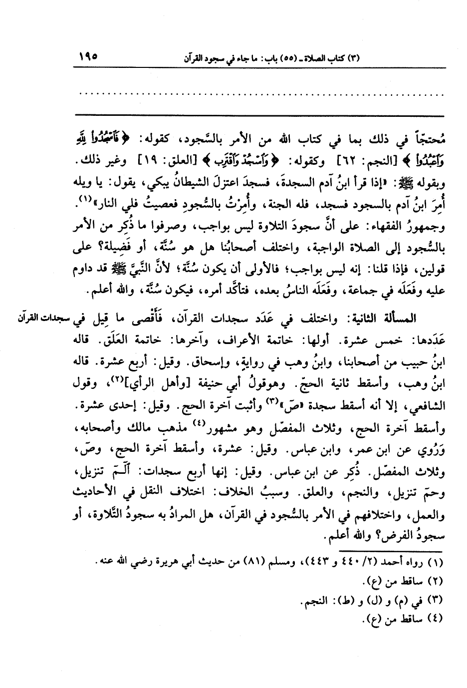 المسألة الثانية: واختلف في عدد سجدات القرآن، فأقصى ما قيل في عددها: خمس عشرة؛ أوّلها: خاتمة الأعراف، وآخرها: خاتمة العلق، قاله ابن حبيب من أصحابنا، وابن وهب في رواية، وإسحاق. وقيل: أربع عشرة. قاله ابن وهب، وأسقط ثانية الحج، وهو قول أبي حنيفة وأهل الرأي (¬2)، وقول الشافعي، إلا أنه أسقط سجدة ص (¬3)، وأثبت آخرة الحج، وقيل: إحدى عشرة، وأسقط آخرة الحج وثلاث المفصل، وهو مشهور (¬4) مذهب مالك وأصحابه، وروي عن ابن عمر وابن عباس. وقيل: عشرة، وأسقط آخرة الحج، وص، وثلاث المفصل؛ ذُكر عن ابن عباس. وقيل: إنها أربع سجدات: الم تنزيل، وحم تنزيل، والنجم، والعلق. وسبب الخلاف: اختلاف النقل في الأحاديث والعمل، واختلافهم في الأمر بالسجود في القرآن: هل المراد به سجود التلاوة، أو سجود الفرض، والله أعلم.