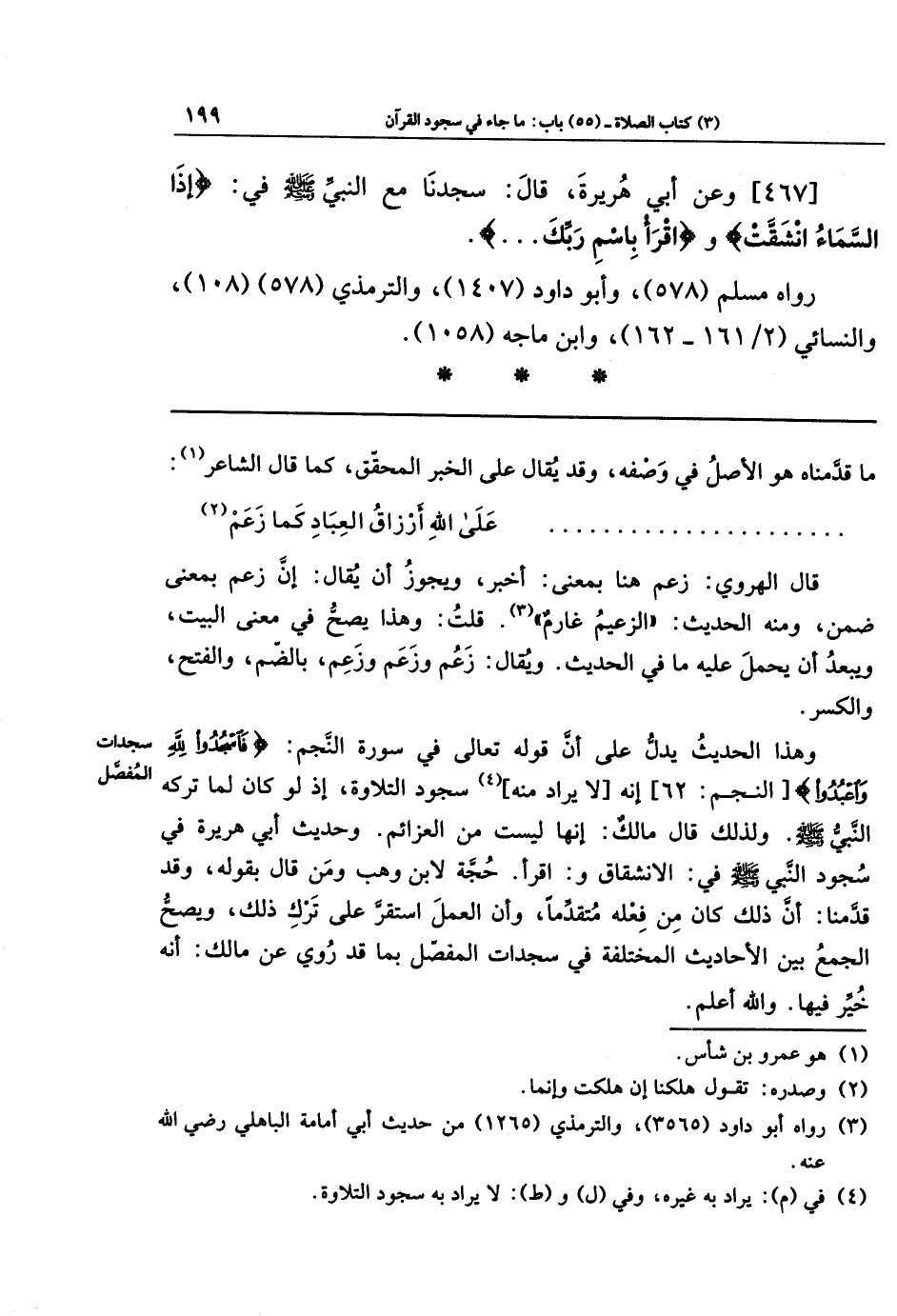 [467] وعن أبِي هُرَيرَةَ قَالَ: سَجَدنَا مَعَ النَّبِيِّ - صلى الله عليه وسلم - فِي {إِذَا السَّمَاءُ انشَقَّت} و {اقرَأ بِاسمِ رَبِّكَ}