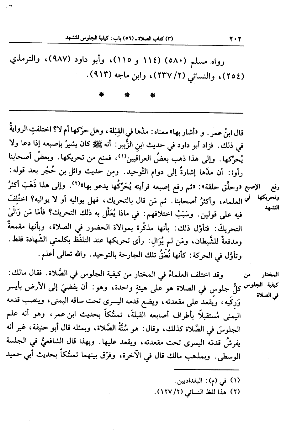 ومن حديث وائل بن حجر بعد قوله: وحلَّق حلقة: ثم رفع إصبعه فرأيته يحركها يدعو بها (¬2). وإلى هذا ذهب أكثر العلماء وأكثر أصحابنا. ثم من قال بالتحريك، فهل يواليه أو لا يواليه؟ اختلف فيه على قولين، وسبب اختلافهم في ماذا يعلل به ذلك التحريك؟ فأما من وَالَى التحريك، فتأوّل ذلك بأنها مُذكرة بموالاة الحضور في الصلاة، وبأنها مَقمَعَة ومدفعة للشيطان. ومن لم يوالِ رأى تحريكها عند التلفُّظ بكلمتي الشهادة فقط. وتأوّل في الحركة: كأنها نطق تلك الجارحة بالتوحيد، والله تعالى أعلم.