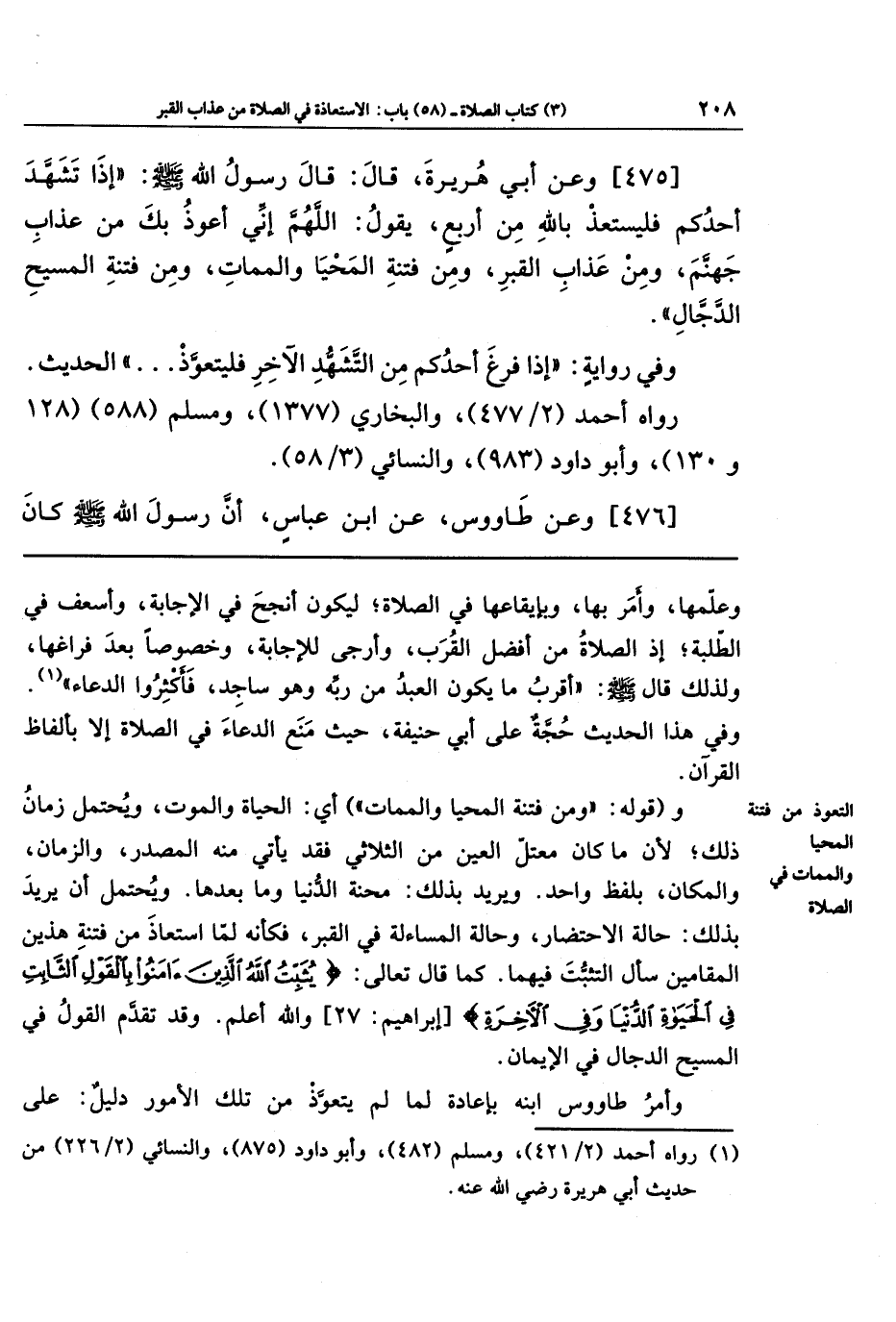 [475]- وَعَن أَبِي هُرَيرَةَ قَالَ: قَالَ رَسُولُ اللَّهِ - صلى الله عليه وسلم -: إِذَا تَشَهَّدَ أَحَدُكُم فَليَستَعِذ بِاللَّهِ مِن أَربَعٍ، يَقُولُ: اللَّهُمَّ إِنِّي أَعُوذُ بِكَ مِن عَذَابِ جَهَنَّمَ، وَمِن عَذَابِ القَبرِ، وَمِن فِتنَةِ المَحيَا وَالمَمَاتِ، وَمِن فِتنَةِ المَسِيحِ الدَّجَّالِ.