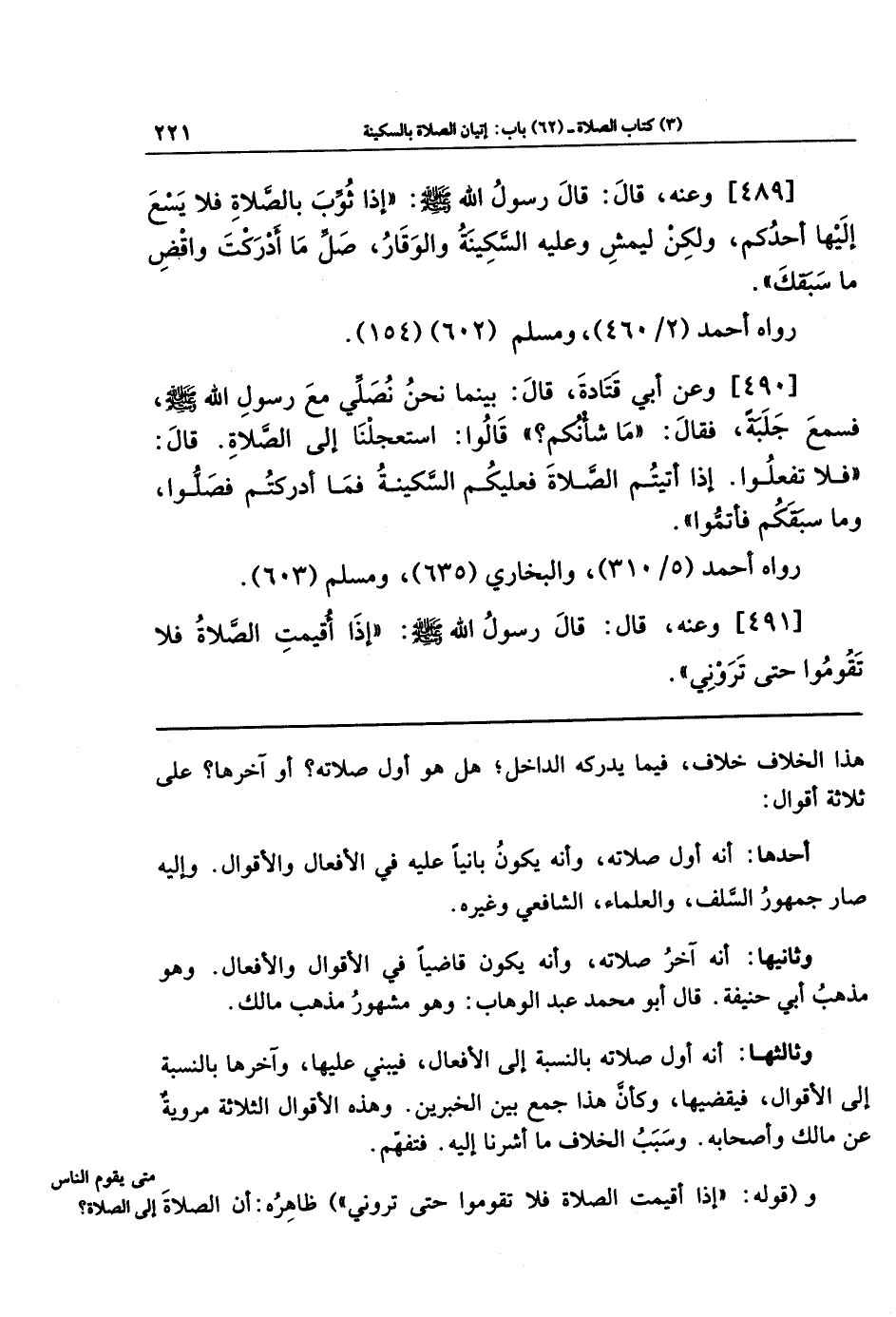 [490] وَعَن أَبِي قَتَادَةَ قَالَ: بَينَمَا نَحنُ نُصَلِّي مَعَ رَسُولِ اللَّهِ - صلى الله عليه وسلم - فَسَمِعَ جَلَبَةً فَقَالَ: مَا شَأنُكُم؟ قَالُوا: استَعجَلنَا إِلَى الصَّلاةِ. قَالَ: فَلا تَفعَلُوا، إِذَا أَتَيتُمُ الصَّلاةَ فَعَلَيكُمُ السَّكِينَةُ، فَمَا أَدرَكتُم فَصَلَّوا، وَمَا سَبَقَكُم فَأَتِمُّوا.