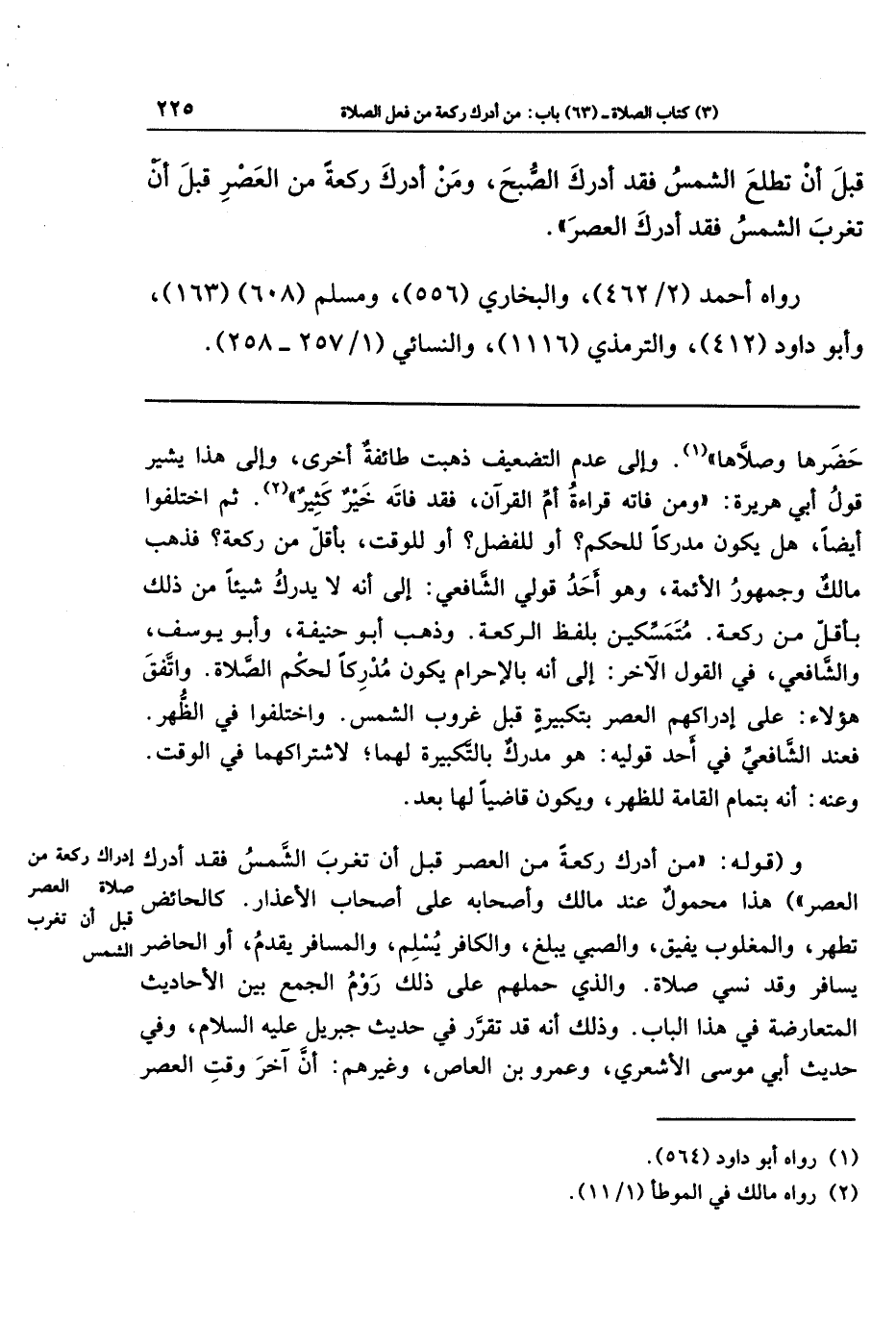 قَبلَ أَن تَطلُعَ الشَّمسُ فَقَد أَدرَكَ الصُّبحَ، وَمَن أَدرَكَ رَكعَةً مِنَ العَصرِ قَبلَ أَن تَغرُبَ الشَّمسُ فَقَد أَدرَكَ العَصرَ.