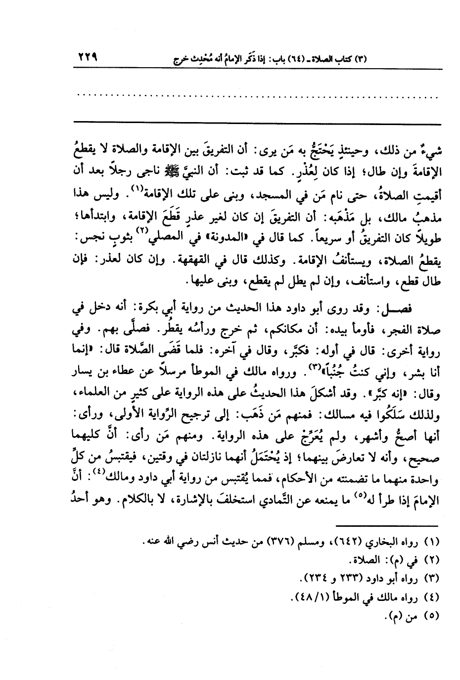 فصل: وقد روى أبو داود هذا الحديث من رواية أبي بكرة: أنه دخل في صلاة الفجر، فأومأ بيده: أن مكانكم، ثم خرج ورأسه يقطر، فصلى بهم. وفي رواية أخرى قال في أوله: فكبر، وقال في آخره: فلما قضى الصلاة قال: إنما أنا بشر، وإني كنت جنبًا (¬3). ورواه مالك في الموطأ مرسلا عن عطاء بن يسار، وقال: إنه كبر. وقد أشكل هذا الحديث على هذه الرواية على كثير من العلماء، ولذلك سلكوا فيه مسالك: فمنهم من ذهب إلى ترجيح الرواية الأولى، ورأى أنها أصح وأشهر، ولم يعرِّج على هذه الرواية. ومنهم من رأى: أن كليهما صحيح، وأنه لا تعارض بينهما؛ إذ يحتمل أنهما نازلتان في وقتين، فيقتبس من كل واحدة منهما ما تضمنته من الأحكام. فمما يقتبس من رواية أبي داود ومالك (¬4): أن الإمام إذا طرأ له (¬5) ما يمنعه عن التمادي، استخلف بالإشارة لا بالكلام، وهو أحد