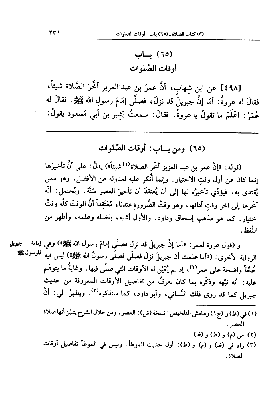 [498]- عَنِ ابنِ شِهَابٍ: أَنَّ عُمَرَ بنَ عَبدِ العَزِيزِ أَخَّرَ الصلاةَ شَيئًا، فَقَالَ لَهُ عُروَةُ: أَمَا إِنَّ جِبرِيلَ قَد نَزَلَ، فَصَلَّى إِمَامَ رَسُولِ اللَّهِ - صلى الله عليه وسلم -، فَقَالَ لَهُ عُمَرُ: اعلَم مَا تَقُولُ يَا عُروَةُ! فَقَالَ: سَمِعتُ بَشِيرَ بنَ أَبِي مَسعُودٍ يَقُولُ: