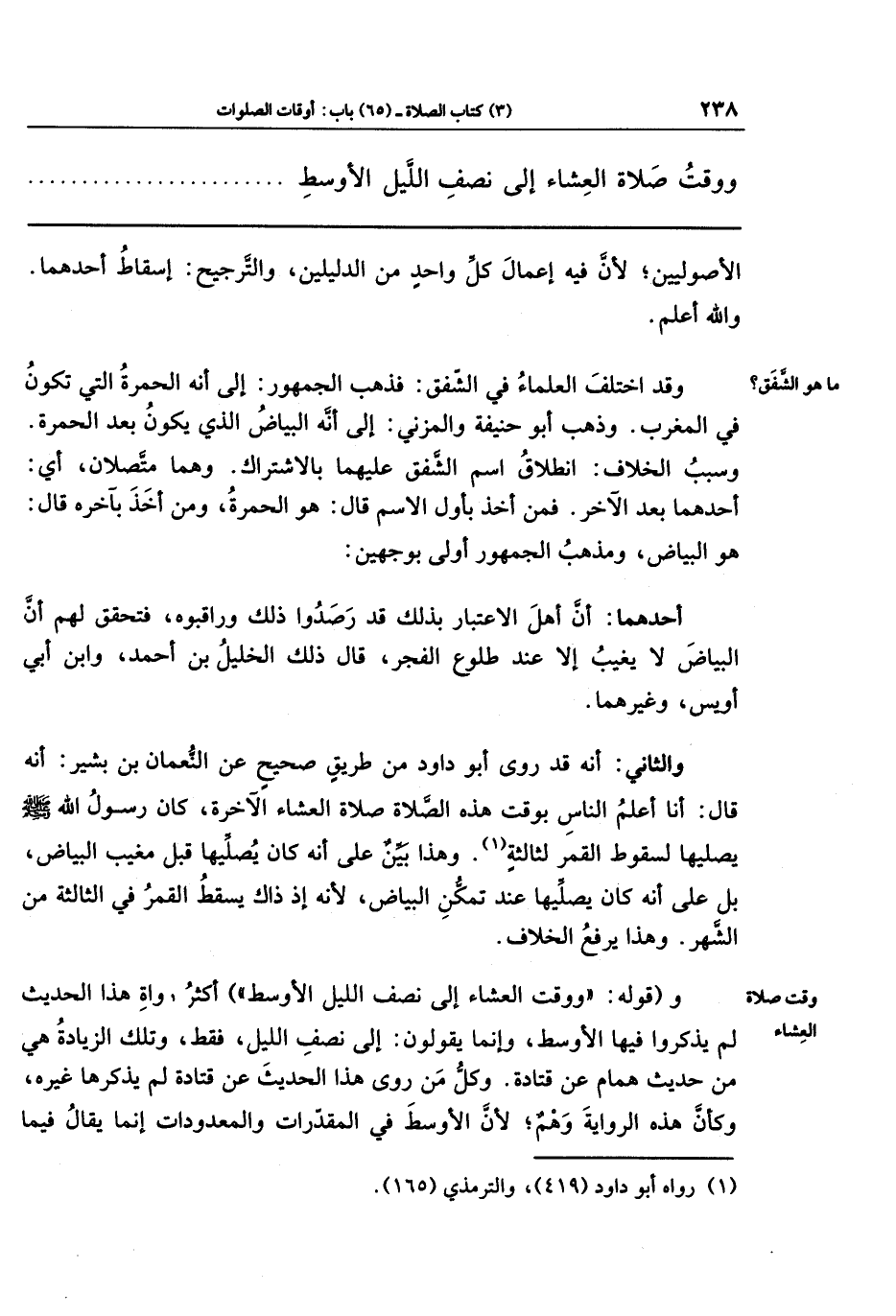 والثاني: أنه قد روى أبو داود من طريق صحيح عن النعمان بن بشير أنه قال: أنا أعلم الناس بوقت هذه الصلاة: صلاة العشاء الآخرة؛ كان رسول الله - صلى الله عليه وسلم - يصليها لسقوط القمر لثالثة (¬1). وهذا بين على أنه كان يصليها قبل مغيب البياض، بل على أنه كان يصليها عند تمكن البياض؛ لأنه إذ ذاك يسقط القمر في الثالثة من الشهر، وهذا يرفع الخلاف.