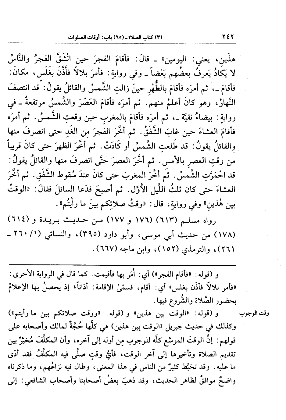 هَذَينِ - يَعنِي: اليَومَينِ، قَالَ: فَأَقَامَ الفَجرَ حِينَ انشَقَّ الفَجرُ وَالنَّاسُ لا يَكَادُ يَعرِفُ بَعضُهُم بَعضًا - وفِي رِوَايَةٍ: فَأَمَرَ بِلالا فَأَذَّنَ بِغَلَسٍ، مَكَان: فأَقَامَ -، ثُمَّ أَمَرَهُ فَأَقَامَ بِالظُّهرِ حِينَ زَالَتِ الشَّمسُ، وَالقَائِلُ يَقُولُ: قَدِ انتَصَفَ النَّهَارُ، وَهُوَ كَانَ أَعلَمَ مِنهُم، ثُمَّ أَمَرَهُ فَأَقَامَ العَصرِ وَالشَّمسُ مُرتَفِعَةٌ - في رواية: بيضاء نقية -، ثُمَّ أَمَرَهُ فَأَقَامَ بالمَغرِبَ حِينَ وَقَعَتِ الشَّمسُ، ثُمَّ أَمَرَهُ فَأَقَامَ العِشَاءَ حِينَ غَابَ الشَّفَقُ، ثُمَّ أَخَّرَ الفَجرَ مِنَ الغَدِ حَتَّى انصَرَفَ مِنهَا، وَالقَائِلُ يَقُولُ: قَد طَلَعَتِ الشَّمسُ أَو كَادَت، ثُمَّ أَخَّرَ الظُّهرَ حَتَّى كَانَ قَرِيبًا مِن وَقتِ العَصرِ بِالأَمسِ. ثُمَّ أَخَّرَ العَصرَ حَتَّى انصَرَفَ مِنهَا، وَالقَائِلُ يَقُولُ: قَدِ احمَرَّتِ الشَّمسُ، ثُمَّ أَخَّرَ المَغرِبَ حَتَّى كَانَ عِندَ سُقُوطِ الشَّفَقِ، ثُمَّ أَخَّرَ العِشَاءَ حَتَّى كَانَ ثُلُثُ اللَّيلِ الأَوَّلِ، ثُمَّ أَصبَحَ فَدَعَا السَّائِلَ فَقَالَ: الوَقتُ بَينَ هَذَينِ. وَفِي رِوَايَةٍ قال: وَقتُ صَلاتِكُم بَينَ مَا رَأَيتُم.