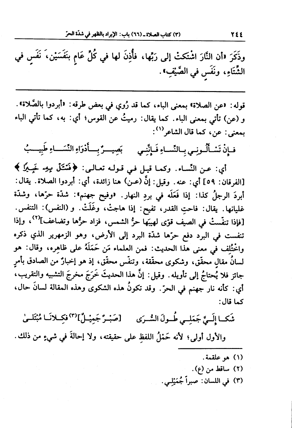 أي: عن النساء. وكما قيل في قوله تعالى: {فَاسأَل بِهِ خَبِيرًا} أي: عنه، وقيل: إن عن هنا زائدة؛ أي: أبردوا الصلاة، يقال: أبرد الرجل كذا: إذا فعله في برد النهار. وفيح جهنم: شدة حرها، وشدة غليانها. يقال: فاحت القدر، تفيح: إذا هاجت، وغلت. والنفس: التنفس. [فإذا تنفست في الصيف قوَّى لهيبُها حرَّ الشمس، فزاد حرها وتضاعف] (¬2)، وإذا تنفست في البرد دفع حرها شدة البرد إلى الأرض، وهو الزمهرير الذي ذكره. واختُلف في معنى هذا الحديث؛ فمن العلماء من حمله على ظاهره، وقال: هو لسان مقال محقق، وشكوى محققة، وتنفس محقق؛ إذ هو إخبار من الصادق بأمر جائز، فلا يُحتاج إلى تأويله. وقيل: إن هذا الحديث خرج مخرج التشبيه والتقريب؛ أي: كأنه نار جهنم في الحر، وقد تكون هذه الشكوى وهذه المقالة لسان حال، كما قال: