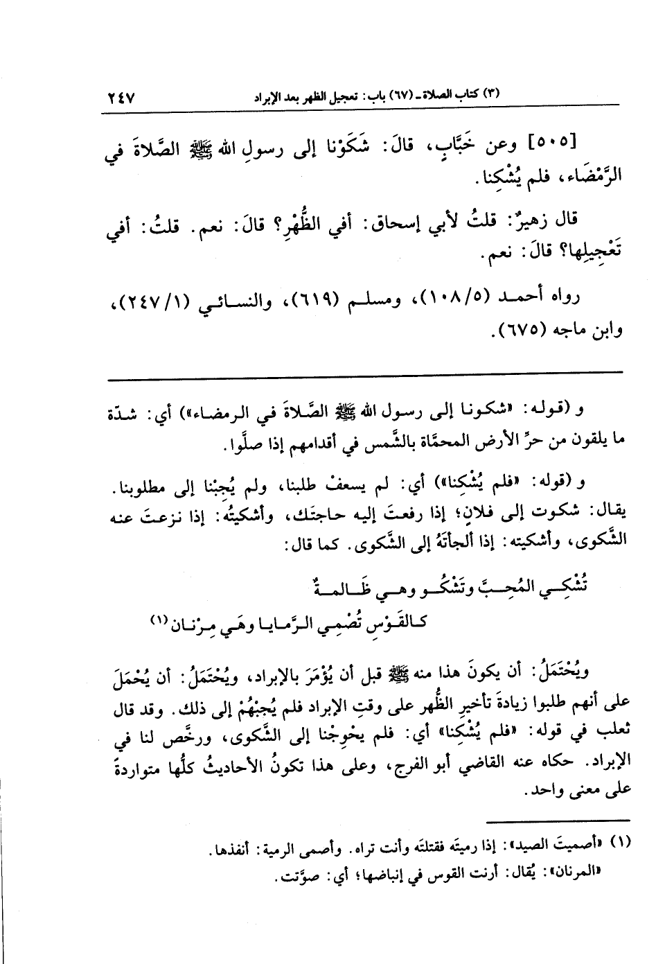 [505]- وعَن خَبَّابِ قَالَ: شَكَونَا إِلَى رَسُولِ اللَّهِ - صلى الله عليه وسلم - الصَّلاةَ فِي الرَّمضَاءِ فَلَم يُشكِنَا.