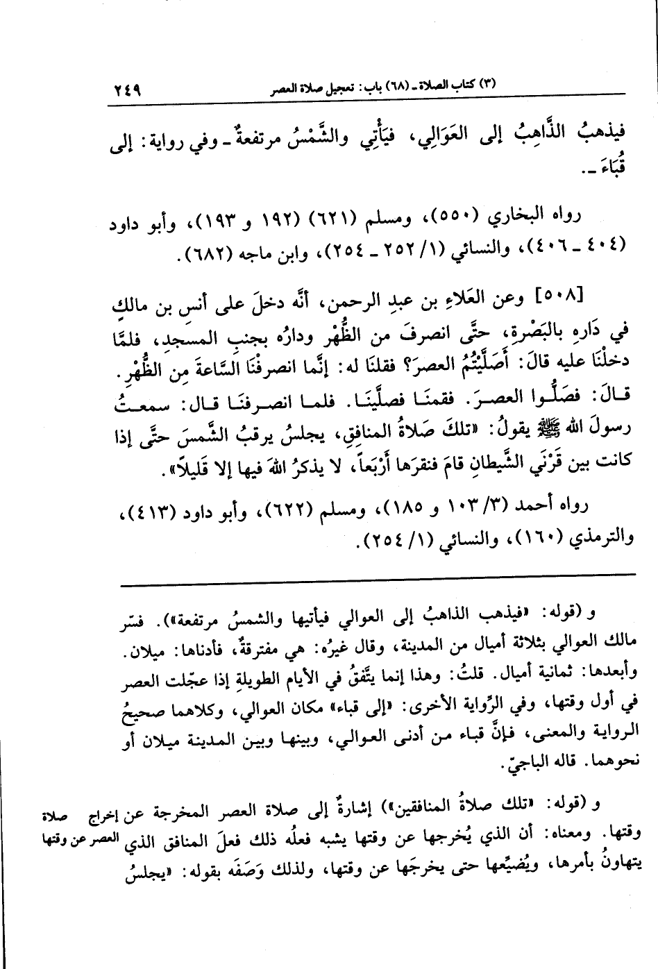 [508]- وَعَنِ العَلاءِ بنِ عَبدِ الرَّحمَنِ، أَنَّه دَخَلَ عَلَى أَنَسِ بنِ مَالِكٍ فِي دَارِهِ بِالبَصرَةِ حتى انصَرَفَ مِنَ الظُّهرِ، وَدَارُهُ بِجَنبِ المَسجِدِ، فَلَمَّا دَخَلنَا عَلَيهِ قَالَ: أَصَلَّيتُمُ العَصرَ؟ فَقُلنَا لَهُ: إِنَّمَا انصَرَفنَا السَّاعَةَ مِنَ الظُّهرِ. قَالَ: فَصَلَّوُا العَصرَ. فَقُمنَا فَصَلَّينَا، فَلَمَّا انصَرَفنَا، قَالَ: سَمِعتُ رَسُولَ اللَّهِ - صلى الله عليه وسلم - يَقُولُ: تِلكَ صَلاةُ المُنَافِقِ، يَجلِسُ يَرقُبُ الشَّمسَ، حَتَّى إِذَا كَانَت بَينَ قَرنَيِ الشَّيطَانِ قَامَ فَنَقَرَهَا أَربَعًا، لا يَذكُرُ اللَّهَ فِيهَا إِلا قَلِيلا.