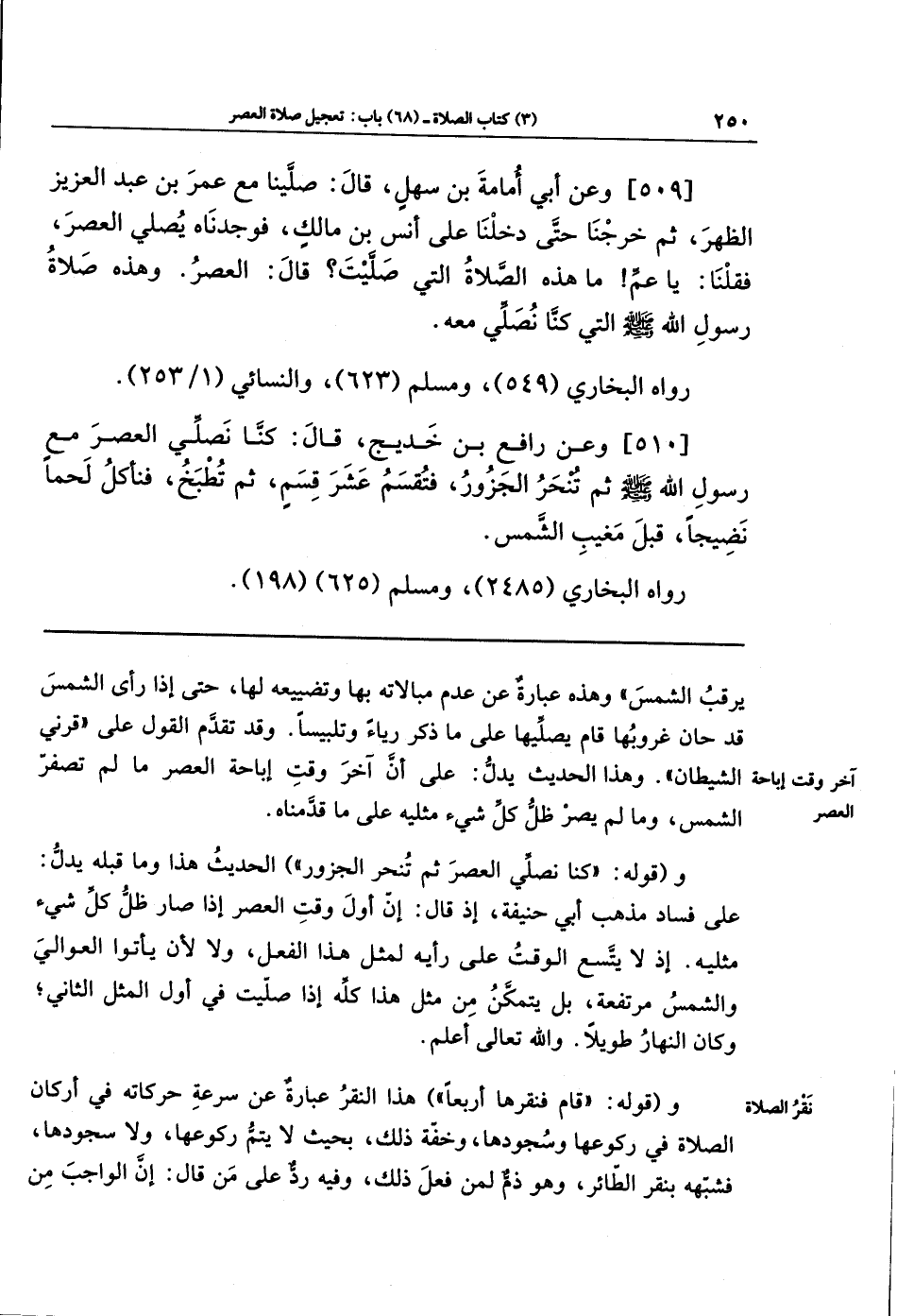 [510]- وَعَن رَافِعَ بنِ خَدِيجٍ قَالَ: كُنَّا نُصَلِّي العَصرَ مَعَ رَسُولِ اللَّهِ - صلى الله عليه وسلم -، ثُمَّ تنحَرُ الجَزُورَ، فَتُقسَمُ عَشَرَ قِسَمٍ، ثُمَّ تُطبَخُ، فَنَأكُلُ لَحمًا نَضِيجًا قَبلَ مَغِيبِ الشَّمسِ.