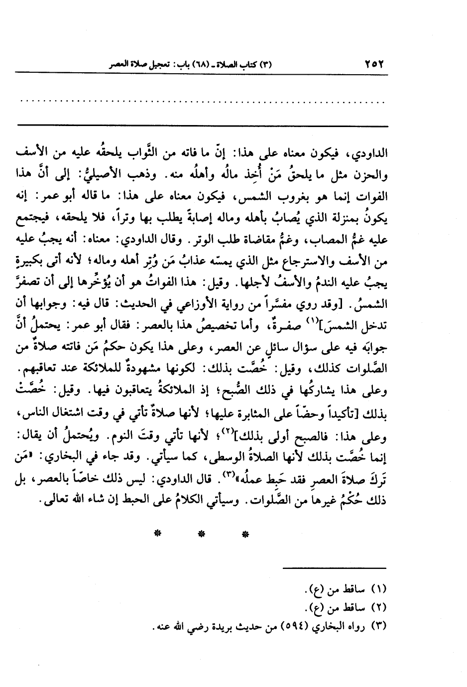 الداودي. فيكون معناه على هذا: إن ما فاته من الثواب يلحقه عليه من الأسف والحزن مثل ما يلحق من أُخذ ماله وأهله منه. وذهب الأصيلي: إلى أن هذا الفوات إنما هو بغروب الشمس، فيكون معناه على هذا: ما قاله أبو عمر: إنه يكون بمنزلة الذي يصاب بأهله وماله إصابة يطلب بها وترًا، فلا يلحقه، فيجتمع عليه غمُّ المصاب، وغمُّ مقاضاة طلب الوتر. وقال الداودي: معناه: أنه يجب عليه من الأسف والاسترجاع مثل الذي يمسه عذاب من وتر أهله وماله؛ لأنه أتى بكبيرة يجب عليه الندم والأسف لأجلها. وقيل: هذا الفوات هو أن يؤخرها إلى أن تصفر الشمس، [وقد روي مفسرًا من رواية الأوزاعي في الحديث؛ قال فيه: وجوابها أن تدخل الشمس] (¬1) صفرة. وأما تخصيص هذا بالعصر، فقال أبو عمر: يحتمل أن جوابه فيه على سؤال سائل عن العصر، وعلى هذا يكون حكم من فاتته صلاة من الصلوات كذلك. وقيل: خصت بذلك: لكونها مشهودة للملائكة عند تعاقبهم، وعلى هذا يشاركها في ذلك الصبح؛ إذ الملائكة يتعاقبون فيها. وقيل: خصت بذلك [تأكيدًا وحضًّا على المثابرة عليها؛ لأنها صلاة تأتي في وقت اشتغال الناس. وعلى هذا فالصبح أولى بذلك] (¬2)؛ لأنها تأتي وقت النوم. ويحتمل أن يقال: إنما خصت بذلك لأنها الصلاة الوسطى، كما سيأتي. وقد جاء في البخاري: من ترك صلاة العصر فقد حبط عمله (¬3). قال الداودي: ليس ذلك خاصًّا بالعصر، بل ذلك حكم غيرها من الصلوات. وسيأتي الكلام على الحَبطِ إن شاء الله تعالى.