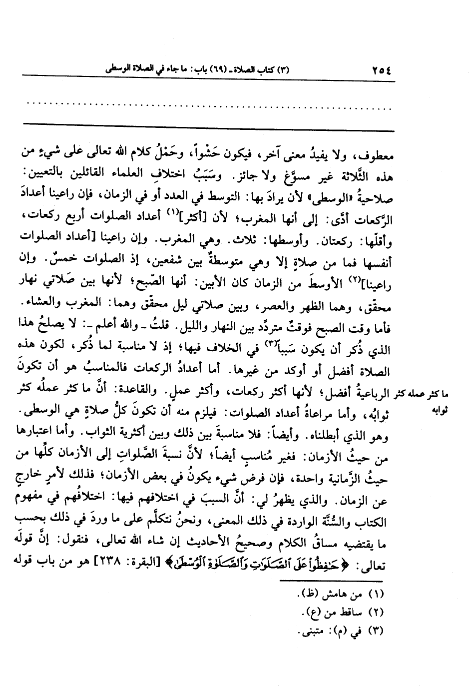 معطوف، ولا يفيد معنى آخر، فيكون حشوًا. وحمل كلام الله تعالى على شيء من هذه الثلاثة غير مسوّغ ولا جائز. وسبب اختلاف العلماء القائلين بالتعيين: صلاحية الوسطى لأن يراد بها: التوسطُ في العدد أو في الزمان. فإن راعينا أعداد الركعات، أدّى إلى أنها المغرب؛ لأن [أكثر] (¬1) أعداد الصلوات أربع ركعات، وأقلها ركعتان، وأوسطها ثلاث، وهي المغرب. وإن راعينا [أعداد الصلوات أنفسها، فما من صلاة إلا وهي متوسطة بين شفعين؛ إذ الصلوات خمس. وإن راعينا] (¬2) الأوسط من الزمان؛ كان الأبين: أنها الصبح؛ لأنها بين صلاتي نهار محقق، وهما الظهر والعصر، وبين صلاتي ليل محقق وهما: المغرب والعشاء. فأما وقت الصبح فوقت متردد بين النهار والليل. قلت - والله أعلم -: لا يصلح هذا الذي ذكر أن يكون سببًا (¬3) في الخلاف فيها؛ إذ لا مناسبة لما ذكر، لكون هذه الصلاة أفضل أو أوكد من غيرها. أما أعداد الركعات، فالمناسب هو أن تكون الرباعية أفضل؛ لأنها أكثر ركعات وأكثر عمل. والقاعدة: أن ما كثر عمله كثر ثوابه. وأما مراعاة أعداد الصلوات؛ فيلزم منه أن تكون كل صلاة هي الوسطى، وهو الذي أبطلناه، وأيضا فلا مناسبة بين ذلك وبين أكثرية الثواب. وأما اعتبارها من حيث الأزمان فغير مناسب أيضًا؛ لأن نسبة الصلوات إلى الأزمان كلها من حيث الزمانية واحدة، فإن فرض شيء يكون في بعض الأزمان، فذلك لأمر خارج عن الزمان. والذي يظهر لي: أن السبب في اختلافهم فيها: اختلافهم في مفهوم الكتاب والسنة الواردة في ذلك المعنى، ونحن نتكلم على ما ورد في ذلك بحسب ما يقتضيه مساق الكلام وصحيح الأحاديث إن شاء الله تعالى، فنقول: إن قوله تعالى: {حَافِظُوا عَلَى الصَّلَوَاتِ وَالصَّلاةِ الوُسطَى} هو من باب قوله