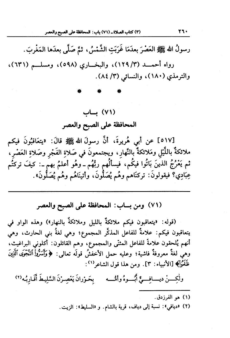 [517]- عَن أَبِي هُرَيرَةَ: أَنَّ رَسُولَ اللَّهِ - صلى الله عليه وسلم - قَالَ: يَتَعَاقَبُونَ فِيكُم مَلائِكَةٌ بِاللَّيلِ وَمَلائِكَةٌ بِالنَّهَارِ، وَيَجتَمِعُونَ فِي صَلاةِ الفجر وَصَلاةِ العَصرِ، ثُمَّ يَعرُجُ الَّذِينَ بَاتُوا فِيكُم، فَيَسأَلُهُم رَبُّهُم - وَهُوَ أَعلَمُ بِهِم -: كَيفَ تَرَكتُم عِبَادِي؟ فَيَقُولُونَ: تَرَكنَاهُم وَهُم يُصَلُّونَ وَأَتَينَاهُم وَهُم يُصَلُّونَ.