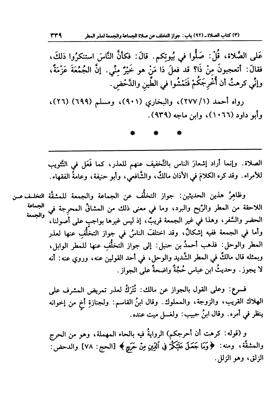 وظاهر هذين الحديثين: جواز التخلف عن الجماعة والجمعة للمشقة اللاحقة من المطر والريح والبرد، وما في معنى ذلك من المشاق المحرجة في الحضر والسفر، وهذا في غير الجمعة قريب؛ إذ ليس غيرها بواجب على أصولنا، وأما في الجمعة ففيه إشكال، وقد اختلف الناس في جواز التخلف عنها لعذر المطر والوحل، فذهب أحمد بن حنبل إلى جواز التخلف عنها للمطر الوابل، وبمثله قال مالك في المطر الشديد والوحل في أحد القولين عنه، وروي عنه أنه لا يجوز، وحديث ابن عباس حجة واضحة على الجواز.