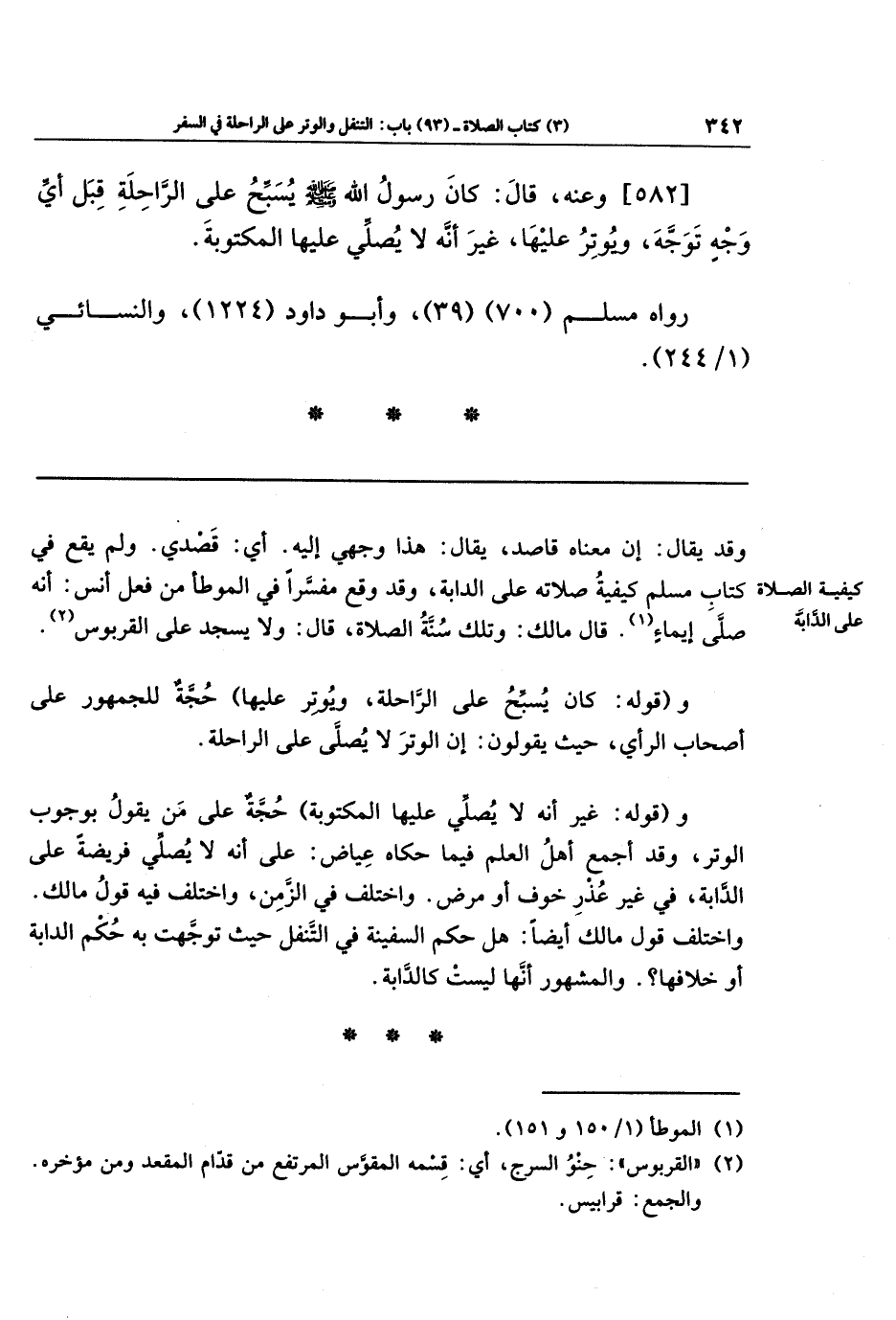 [582]- وعَنهُ، قَالَ: كَانَ رَسُولُ اللهِ - صلى الله عليه وسلم - يُسَبِّحُ عَلَى الرَّاحِلَةِ قِبَلَ أَيِّ وَجهٍ تَوَجَّهَ، وَيُوتِرُ عَلَيهَا، غَيرَ أنَّهُ لا يُصَلِّي عَلَيهَا المَكتُوبَةَ.