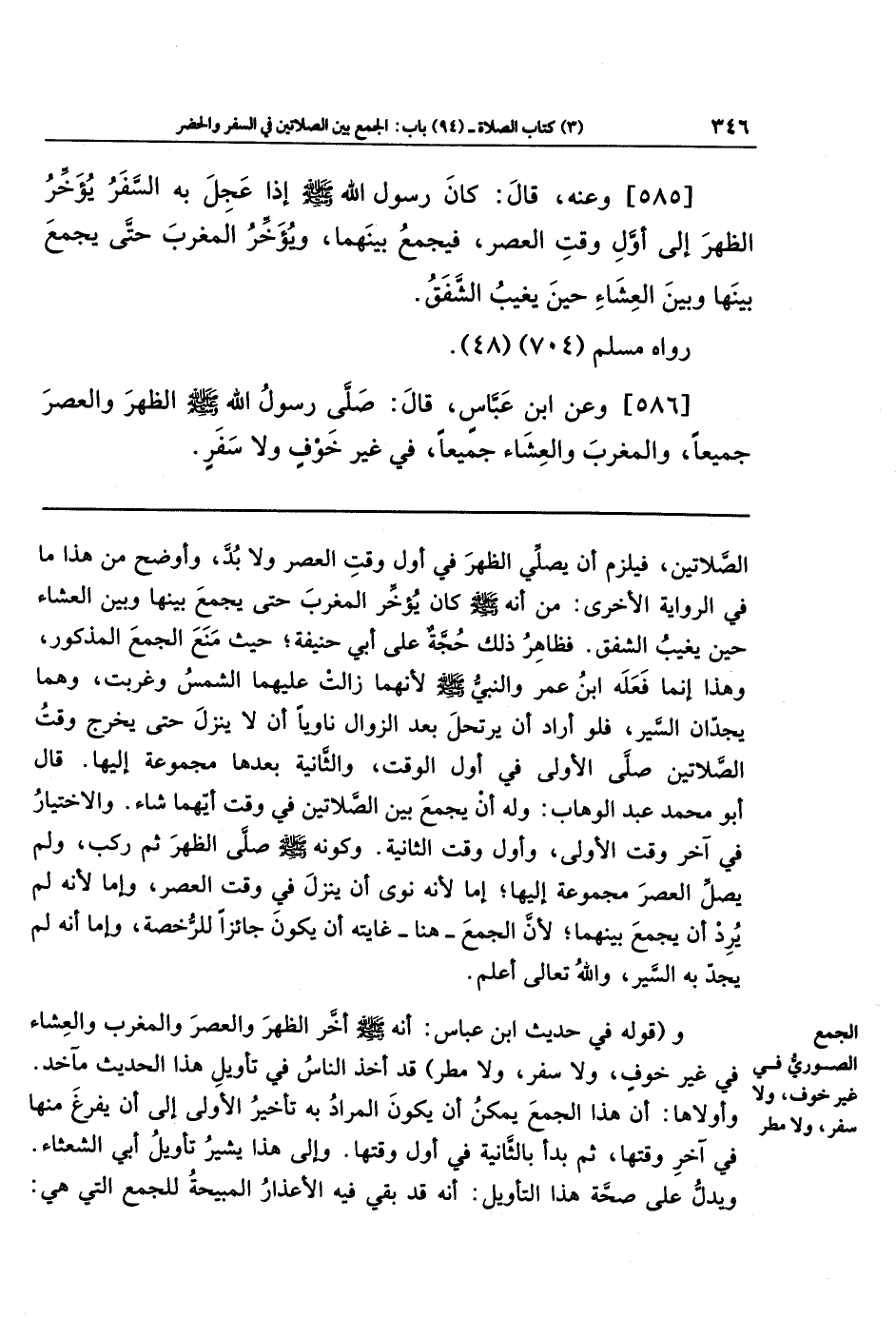 [586]- وعَنِ ابنِ عَبَّاسٍ قَالَ: صَلَّى رَسُولُ اللهِ - صلى الله عليه وسلم - الظُّهرَ وَالعَصرَ جَمِيعًا، وَالمَغرِبَ وَالعِشَاءَ جَمِيعًا، فِي غَيرِ خَوفٍ وَلا سَفَرٍ.