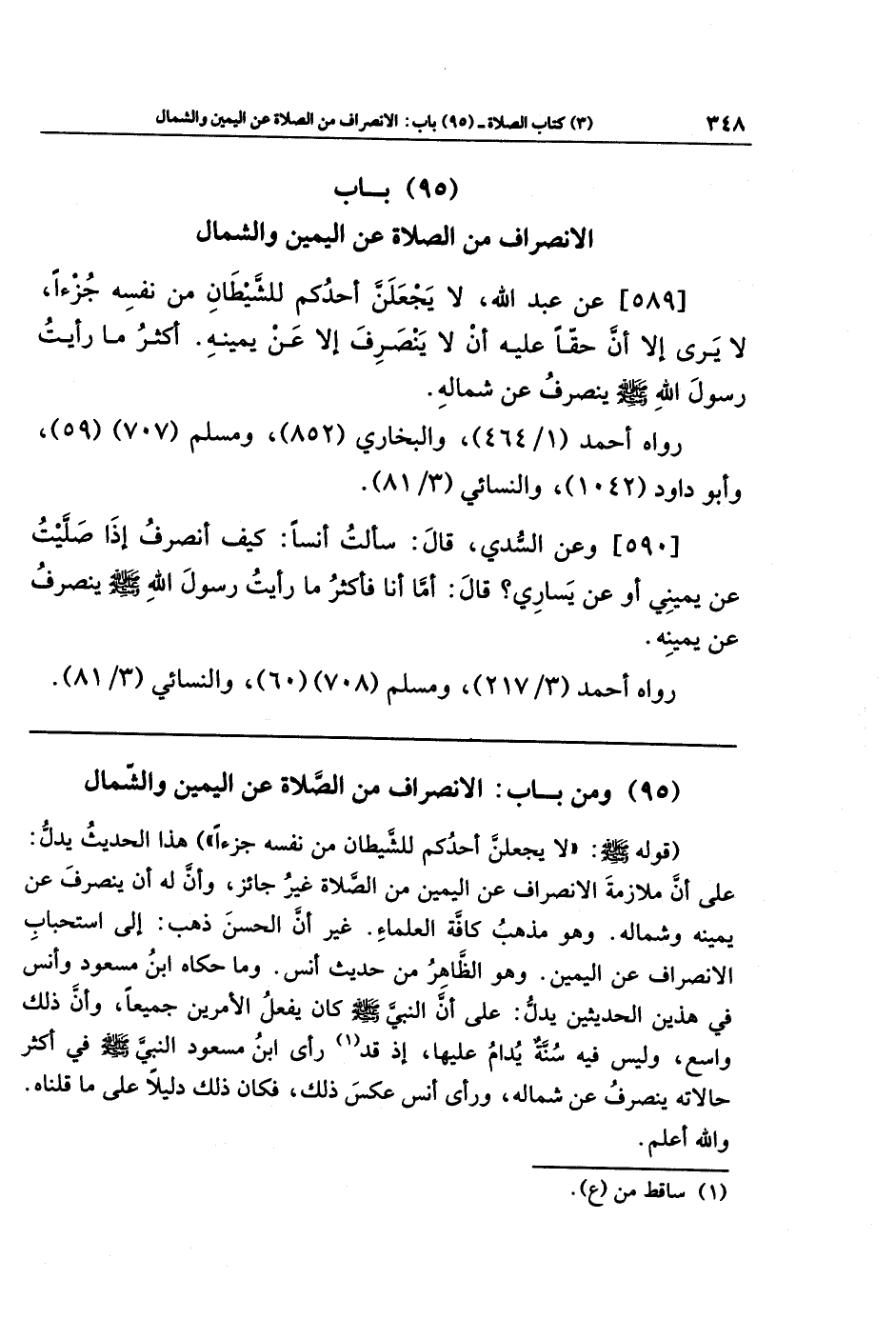 [589]- عَن عبد الله: لا يَجعَلَنَّ أَحَدُكُم لِلشَّيطَانِ مِن نَفسِهِ جُزءًا، لا يَرَى إِلا أَنَّ حَقًّا عَلَيهِ أَن لا يَنصَرِفَ إِلا عَن يَمِينِهِ. أَكثَرُ مَا رَأَيتُ رَسُولَ اللهِ - صلى الله عليه وسلم - يَنصَرِفُ عَن شِمَالِهِ.