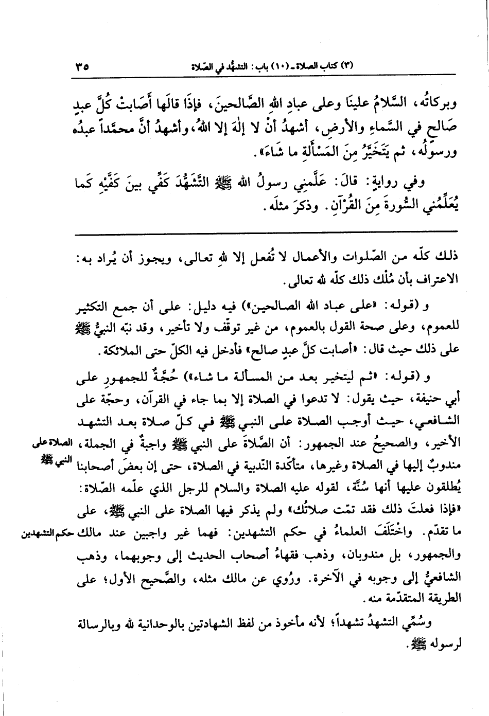 وَبَرَكَاتُهُ، السَّلامُ عَلَينَا وَعَلَى عِبَادِ اللهِ الصَّالِحِينَ، فَإِذَا قَالَهَا أَصَابَت كُلَّ عَبدٍ صَالِحٍ فِي السَّمَاءِ وَالأَرضِ، أَشهَدُ أَن لا إِلهَ إِلا اللهُ وَأَشهَدُ أَنَّ مُحَمَّدًا عَبدُهُ وَرَسُولُهُ، ثُمَّ يَتَخَيَّرُ مِنَ المَسأَلَةِ مَا شَاءَ.
