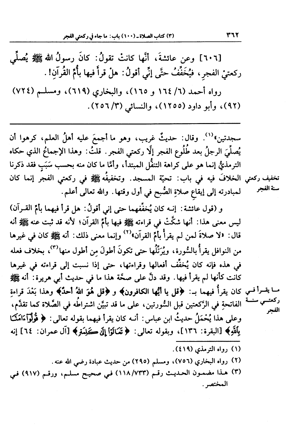 [606] وعن عَائِشَةَ، أَنَّهَا كَانَت تَقُولُ: كَانَ رَسُولُ اللهِ - صلى الله عليه وسلم - يُصَلِّي رَكعَتَيِ الفَجرِ، فَيُخَفِّفُ حَتَّى إِنِّي أَقُولُ: هَل قَرَأَ فِيهِا بِأُمِّ القُرآنِ! .
