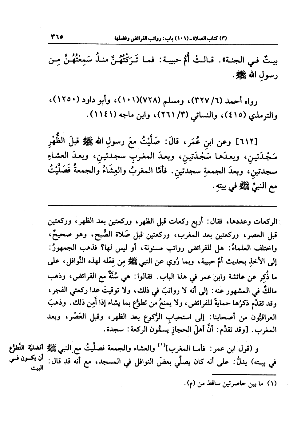 [612]- وعَنِ ابنِ عُمَرَ، قَالَ: صَلَّيتُ مَعَ رَسُولِ اللهِ - صلى الله عليه وسلم - قَبلَ الظُّهرِ سَجدَتَينِ، وَبَعدَهَا سَجدَتَينِ، وَبَعدَ المَغرِبِ سَجدَتَينِ، وَبَعدَ العِشَاءِ سَجدَتَينِ، وَبَعدَ الجُمُعَةِ سَجدَتَينِ. فَأَمَّا المَغرِبُ وَالعِشَاءُ وَالجُمُعَةُ فَصَلَّيتُ مَعَ النَّبِيِّ - صلى الله عليه وسلم - فِي بَيتِهِ.