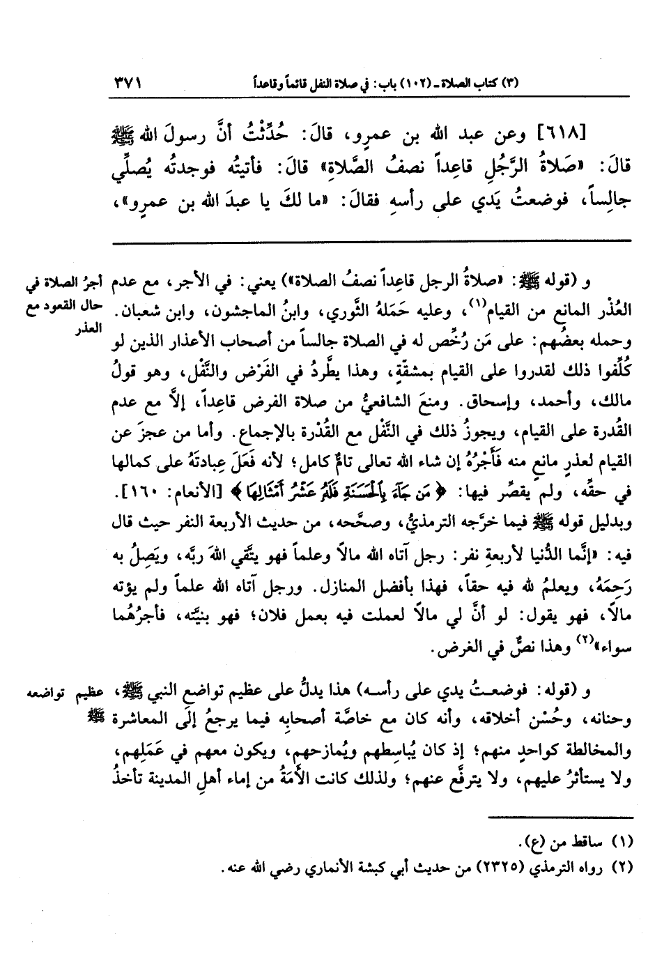 [618]- وعَن عَبدِ الله بنِ عَمرٍو قَالَ: حُدِّثتُ أَنَّ رَسُولَ اللهِ - صلى الله عليه وسلم - قَالَ: صَلاةُ الرَّجُلِ قَاعِدًا نِصفُ الصَّلاةِ. قَالَ: فَأَتَيتُهُ فَوَجَدتُهُ يُصَلِّي جَالِسًا، فَوَضَعتُ يَدِي عَلَى رَأسِهِ فَقَالَ: مَا لَكَ يَا عَبدَ الله بنَ عَمرٍو! ،