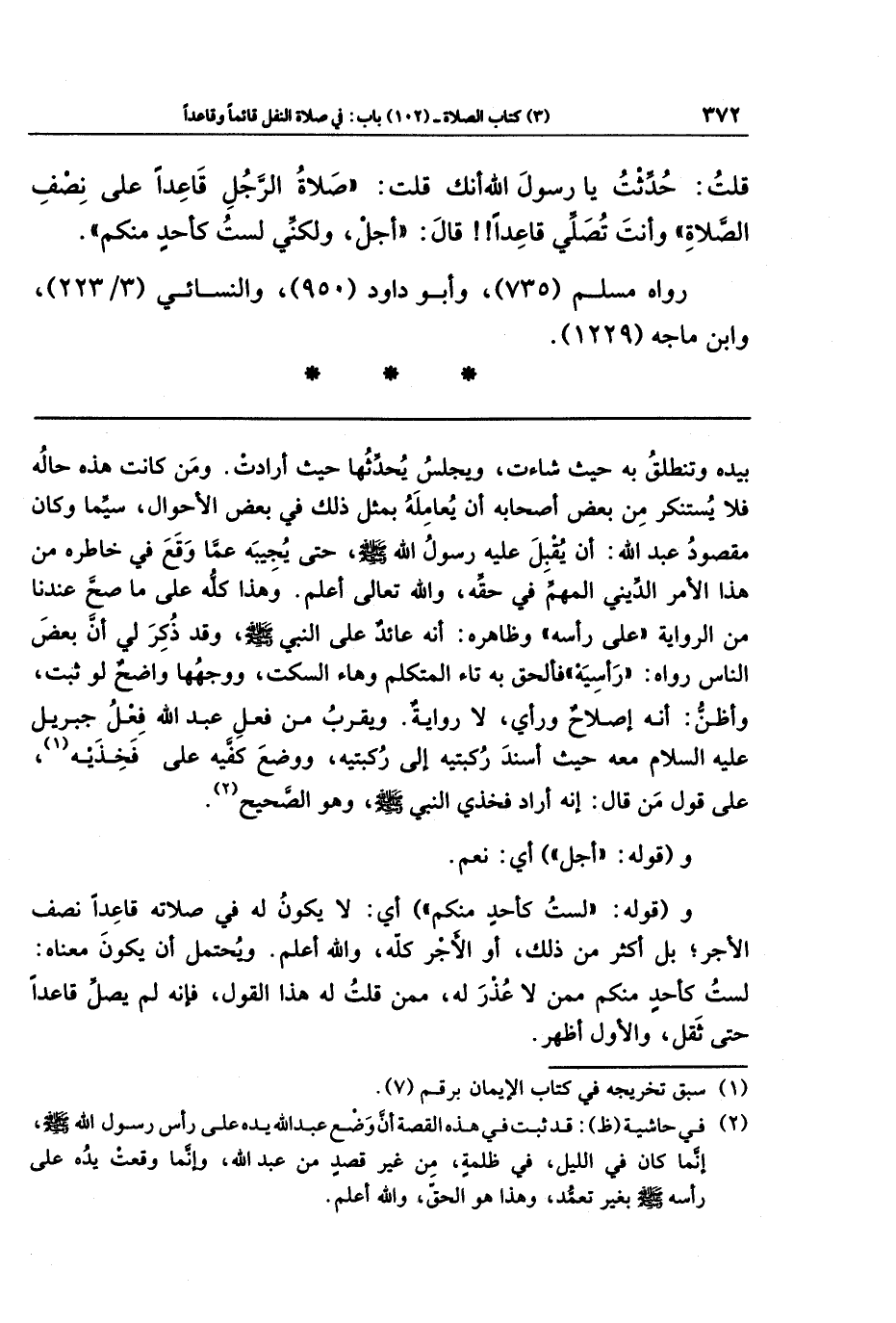 قُلتُ: حُدِّثتُ يَا رَسُولَ اللهِ أَنَّكَ قُلتَ: صَلاةُ الرَّجُلِ قَاعِدًا عَلَى نِصفِ الصَّلاةِ وَأَنتَ تُصَلِّي قَاعِدًا! ! قَالَ: أَجَل، وَلَكِنِّي لَستُ كَأَحَدٍ مِنكُم.
