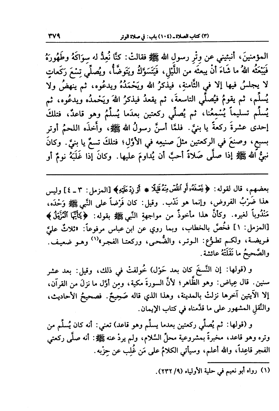 المُؤمِنِينَ، أَنبِئِينِي عَن وِترِ رَسُولِ اللهِ - صلى الله عليه وسلم - فَقَالَت: كُنَّا نُعِدُّ لَهُ سِوَاكَهُ وَطَهُورَهُ فَيَبعَثُهُ الله مَا شَاءَ أَن يَبعَثَهُ مِنَ اللَّيلِ، فَيَتَسَوَّكُ وَيَتَوَضَّأُ، وَيُصَلِّي تِسعَ رَكَعَاتٍ لا يَجلِسُ فِيهَا إِلا فِي الثَّامِنَةِ، فَيَذكُرُ الله وَيَحمَدُهُ وَيَدعُوهُ، ثُمَّ يَنهَضُ وَلا يُسَلِّمُ، ثُمَّ يَقُومُ فَيُصَلِّي التَّاسِعَةَ، ثُمَّ يَقعُدُ فَيَذكُرُ الله وَيَحمَدُهُ وَيَدعُوهُ، ثُمَّ يُسَلِّمُ تَسلِيمًا يُسمِعُنَا، ثُمَّ يُصَلِّي رَكعَتَينِ بَعدَمَا يُسَلِّمُ وَهُوَ قَاعِدٌ، فَتِلكَ إِحدَى عَشرَةَ رَكعَةً يَا بُنَيَّ. فَلَمَّا أسَنَّ رَسُولُ الله - صلى الله عليه وسلم - وَأَخَذَهُ اللَّحمُ أَوتَرَ بِسَبعٍ، وَصَنَعَ فِي الرَّكعَتَينِ مِثلَ صَنِيعِهِ في الأوَّلِ، فَتِلكَ تِسعٌ يَا بُنَيَّ. وَكَانَ نَبِيُّ الله - صلى الله عليه وسلم - إِذَا صَلَّى صَلاةً أَحَبَّ أَن يُدَاوِمَ عَلَيهَا. وَكَانَ إِذَا غَلَبَهُ نَومٌ أَو