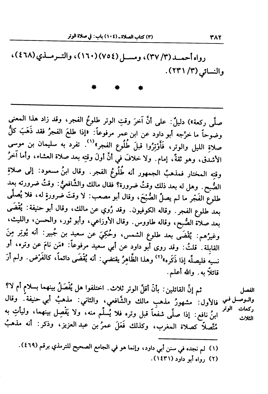 ثم إن القائلين: بأن أقل الوتر ثلاث اختلفوا، هل يفصل بينهما بسلام أم لا؟ فالأول: مشهور مذهب مالك والشافعي، والثاني: مذهب أبي حنيفة. وقال ابن نافع: إذا صلى شفعًا قبل وتره فلا يسلم منه، ولا يفصل بينهما، وليأت به متصلا كصلاة المغرب، وكذلك فعل عمر بن عبد العزيز، وذكر: أنه مذهب