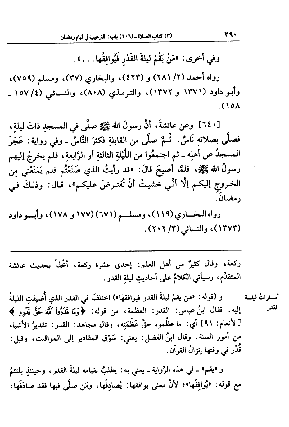 [640]- وعَن عَائِشَةَ: أَنَّ رَسُولَ اللهِ - صلى الله عليه وسلم - صَلَّى فِي المَسجِدِ ذَاتَ لَيلَةٍ، فَصَلَّى بِصَلاتِهِ نَاسٌ. ثُمَّ صَلَّى مِنَ القَابِلَةِ فَكَثُرَ النَّاسُ - وفي رواية: عَجَزَ المَسجِدُ عَن أَهلِهِ - ثُمَّ اجتَمَعُوا مِنَ اللَّيلَةِ الثَّالِثَةِ أَوِ الرَّابِعَةِ، فَلَم يَخرُج إِلَيهِم رَسُولُ اللهِ - صلى الله عليه وسلم -، فَلَمَّا أَصبَحَ قَالَ: قَد رَأَيتُ الَّذِي صَنَعتُم فَلَم يَمنَعنِي مِنَ الخُرُوجِ إِلَيكُم إِلا أَنِّي خَشِيتُ أن تفرَضَ عَلَيكُم، قَالَ: وَذَلِكَ فِي رَمَضَانَ.