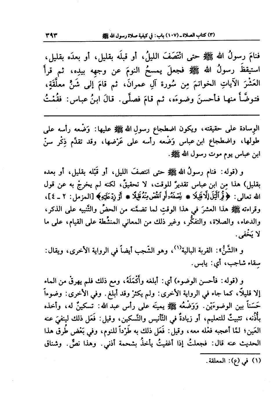 فَنَامَ رَسُولُ اللهِ - صلى الله عليه وسلم - حَتَّى انتَصَفَ اللَّيلُ، أَو قَبلَهُ بِقَلِيلٍ، أَو بَعدَهُ بِقَلِيلٍ، استَيقَظَ رَسُولُ الله - صلى الله عليه وسلم - فَجَعَلَ يَمسَحُ النَّومَ عَن وَجهِهِ بِيَدِهِ، ثُمَّ قَرَأَ العَشرَ الآيَاتِ الخَوَاتِمَ مِن سُورَةِ آلِ عِمرَانَ، ثُمَّ قَامَ إِلَى شَنٍّ مُعَلَّقَةٍ، فَتَوَضَّأَ مِنهَا فَأَحسَنَ وُضُوءَهُ، ثُمَّ قَامَ فَصَلَّى، قَالَ ابنُ عَبَّاسٍ: فَقُمتُ