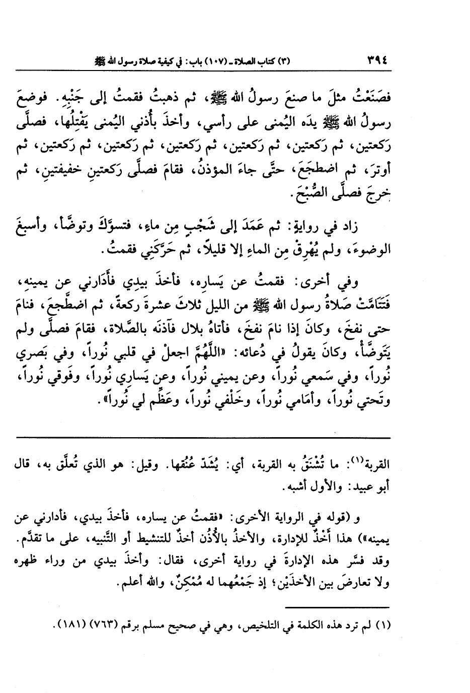 وفِي أُخرَى: فَقُمتُ عَن يَسَارِهِ، فَأَخَذَ بِيَدِي فَأَدَارَنِي عَن يَمِينِهِ، فَتَتَامَّت صَلاةُ رَسُولِ اللهِ - صلى الله عليه وسلم - مِنَ اللَّيلِ ثَلاثَ عَشرَةَ رَكعَةً، ثُمَّ اضطَجَعَ، فَنَامَ حَتَّى نَفَخَ، وَكَانَ إِذَا نَامَ نَفَخَ، فَأَتَاهُ بِلالٌ فَآذَنَهُ بِالصَّلاةِ، فَقَامَ فَصَلَّى وَلَم يَتَوَضَّأ، وَكَانَ يَقُولُ فِي دُعَائِهِ: اللهمَّ اجعَل فِي قَلبِي نُورًا، وَفِي بَصَرِي نُورًا، وَفِي سَمعِي نُورًا، وَعَن يَمِينِي نُورًا، وَعَن يَسَارِي نُورًا، وَفَوقِي نُورًا، وَتَحتِي نُورًا، وَأَمَامِي نُورًا، وَخَلفِي نُورًا، وَعَظِّم لِي نُورًا.