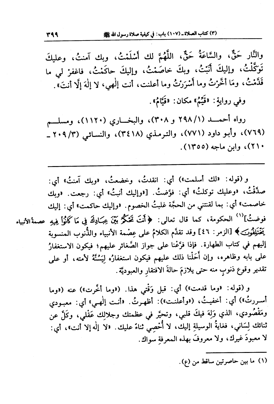 وقوله: لك أسلمت؛ أي: انقَدتُ وخضعت. وبك آمنت؛ أي: صدّقت. وعليك توكلت؛ أي: فوّضت. [وإليك أنبت؛ أي: رجعت. وبك خاصمت؛ أي: بما لقَّنتَنِي من الحجة غلبت الخصوم. وإليك حاكمت؛ أي: إليك فوّضت] (¬1) الحكومة؛ كما قال تعالى: {أَنتَ تَحكُمُ بَينَ عِبَادِكَ فِي مَا كَانُوا فِيهِ يَختَلِفُونَ} وقد تقدم الكلام على عصمة الأنبياء والذنوب المنسوبة إليهم في كتاب الطهارة. فإذا فرّعنا على جواز الصغائر عليهم، فيكون الاستغفار على بابه وظاهره، وإن أحلنا ذلك عليهم، فيكون استغفاره لِيَسُنَّه لأمته، أو على تقدير وقوع ذنوب منه حتى يلازم حالة الافتقار والعبودية.