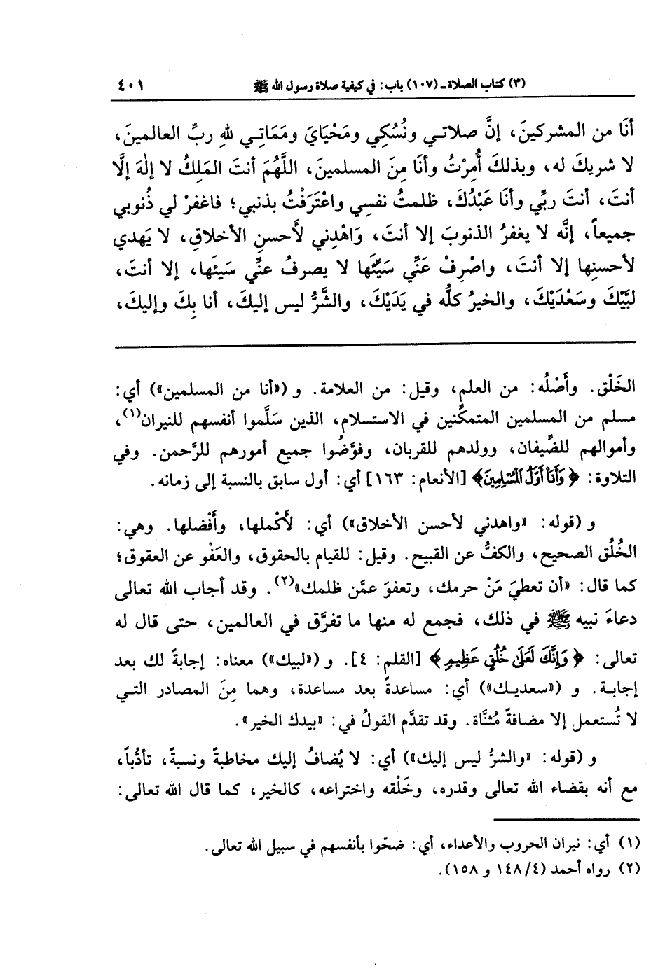 أَنَا مِنَ المُشرِكِينَ، إِنَّ صَلاتِي وَنُسُكِي وَمَحيَايَ وَمَمَاتِي لِلَّهِ رَبِّ العَالَمِينَ، لا شَرِيكَ لَهُ، وَبِذَلِكَ أُمِرتُ وَأَنَا مِنَ المُسلِمِينَ، اللهمَّ أَنتَ المَلِكُ لا إِلهَ إِلا أَنتَ، أَنتَ رَبِّي وَأَنَا عَبدُكَ، ظَلَمتُ نَفسِي وَاعتَرَفتُ بِذَنبِي؛ فَاغفِر لِي ذُنُوبِي جَمِيعًا، إِنَّهُ لا يَغفِرُ الذُّنُوبَ إِلا أَنتَ، وَاهدِنِي لأَحسَنِ الأَخلاقِ، لا يَهدِي لأَحسَنِهَا إِلا أَنتَ، وَاصرِف عَنِّي سَيِّئَهَا لا يَصرِفُ عَنِّي سَيِّئَهَا إِلا أَنتَ، لَبَّيكَ وَسَعدَيكَ، وَالخَيرُ كُلُّهُ فِي يَدَيكَ، وَالشَّرُّ لَيسَ إِلَيكَ، أَنَا بِكَ وَإِلَيكَ،