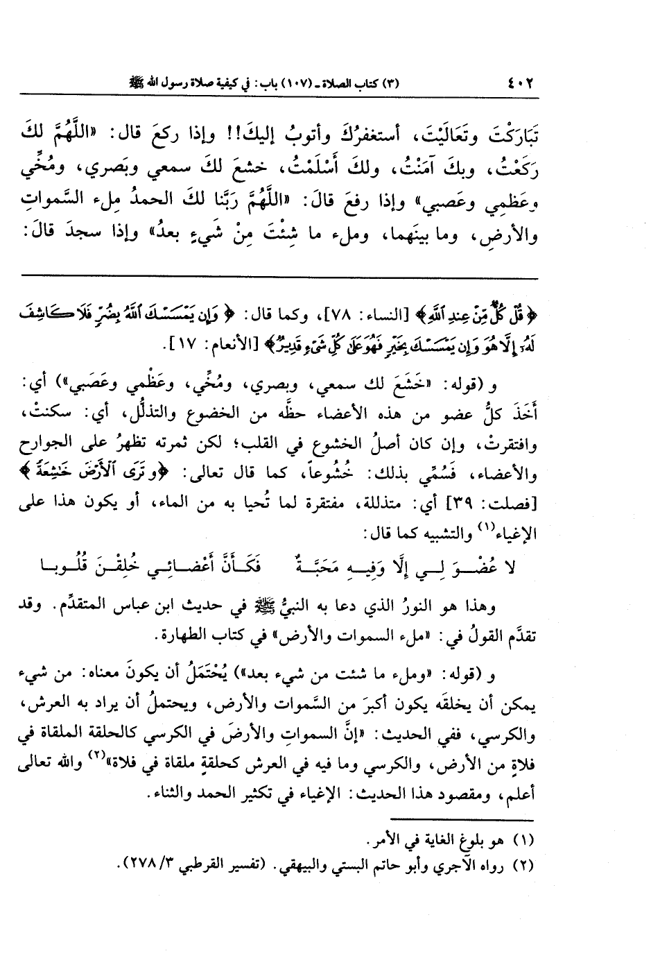 تَبَارَكتَ وَتَعَالَيتَ، أَستَغفِرُكَ وأتوب إِلَيكَ! ! وَإِذَا رَكَعَ قَالَ: اللهمَّ لَكَ رَكَعتُ، وَبِكَ آمَنتُ، وَلَكَ أَسلَمتُ، خَشَعَ لَكَ سَمعِي وَبَصَرِي، وَمُخِّي وَعَظمِي وَعَصَبِي. وَإِذَا رَفَعَ قَالَ: اللهمَّ رَبَّنَا لَكَ الحَمدُ مِلءَ السَّمَاوَاتِ الأَرضِ، وَمَا بَينَهُمَا، وَمِلءَ مَا شِئتَ مِن شَيءٍ بَعدُ. وَإِذَا سَجَدَ قَالَ: