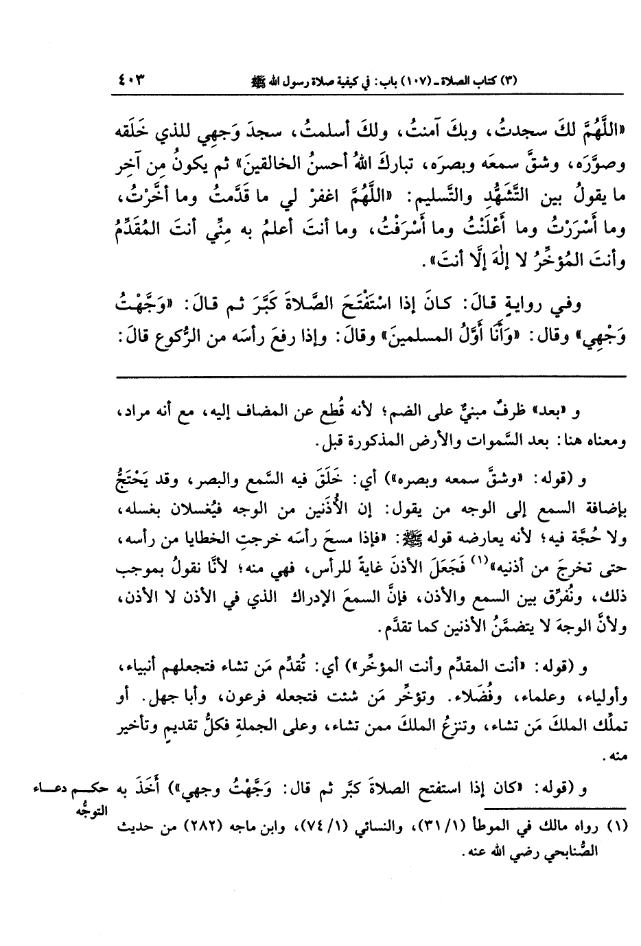 اللهمَّ لَكَ سَجَدتُ، وَبِكَ آمَنتُ، وَلَكَ أَسلَمتُ، سَجَدَ وَجهِي لِلَّذِي خَلَقَهُ وَصَوَّرَهُ، وَشَقَّ سَمعَهُ وَبَصَرَهُ، تَبَارَكَ الله أَحسَنُ الخَالِقِينَ. ثُمَّ يَكُونُ مِن آخِرِ مَا يَقُولُ بَينَ التَّشَهُّدِ وَالتَّسلِيمِ: اللهمَّ اغفِر لِي مَا قَدَّمتُ وَمَا أَخَّرتُ، وَمَا أَسرَرتُ وَمَا أَعلَنتُ وَمَا أَسرَفتُ، وَمَا أَنتَ أَعلَمُ بِهِ مِنِّي، أَنتَ المُقَدِّمُ وَأَنتَ المُؤَخِّرُ لا إِلهَ إِلا أَنتَ.