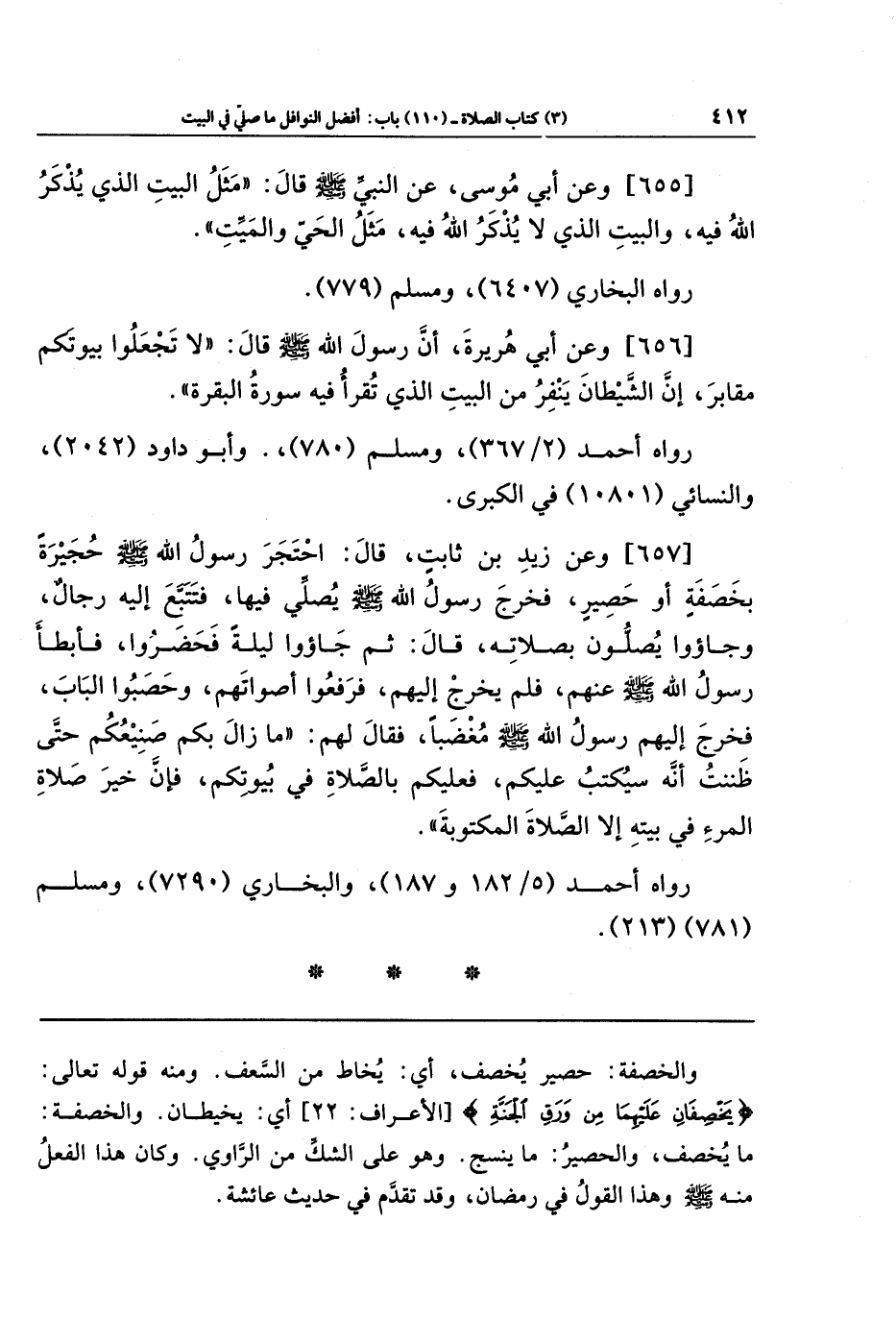 [657]- وعَن زَيدِ بنِ ثَابِتٍ، قَالَ: احتَجَرَ رَسُولُ اللهِ - صلى الله عليه وسلم - حُجَيرَةً بِخَصَفَةٍ أَو حَصِيرٍ، فَخَرَجَ رَسُولُ اللهِ - صلى الله عليه وسلم - يُصَلِّي فِيهَا، فَتَتَبَّعَ إِلَيهِ رِجَالٌ وَجَاؤوا يُصَلُّونَ بِصَلاتِهِ، قَالَ: ثُمَّ جَاؤوا لَيلَةً فَحَضَرُوا، فأَبطَأَ رَسُولُ اللهِ - صلى الله عليه وسلم - عَنهُم، فَلَم يَخرُج إِلَيهِم، فَرَفَعُوا أَصوَاتَهُم، وَحَصَبُوا البَابَ فَخَرَجَ إِلَيهِم رَسُولُ اللهِ - صلى الله عليه وسلم - مُغضَبًا، فَقَالَ لَهُم: مَا زَالَ بِكُم صَنِيعُكُم حَتَّى ظَنَنتُ أَنَّهُ سَيُكتَبُ عَلَيكُم، فَعَلَيكُم بِالصَّلاةِ فِي بُيُوتِكُم، فَإِنَّ خَيرَ صَلاةِ المَرءِ فِي بَيتِهِ إِلا الصَّلاةَ المَكتُوبَةَ.