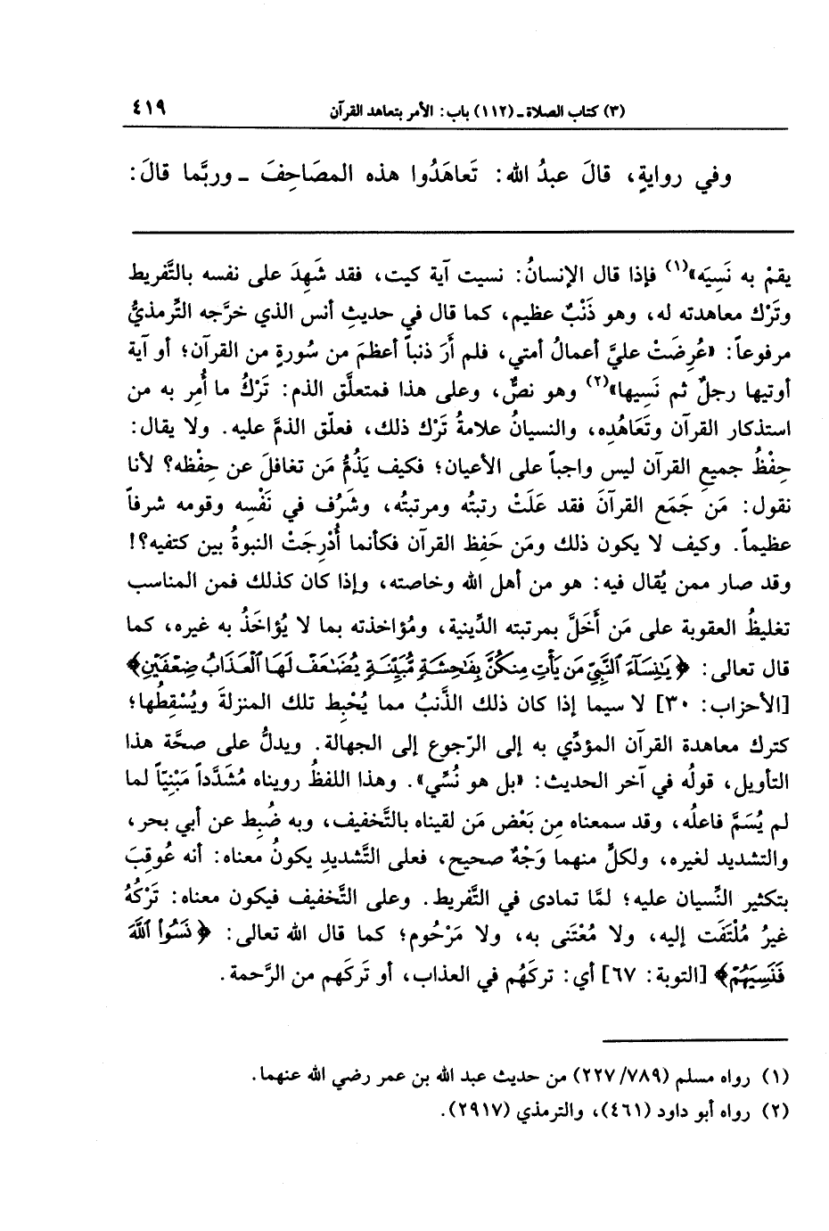 يقم به نسيه (¬1). فإذا قال الإنسان: نسيت آية كيت فقد شهد على نفسه بالتفريط وترك معاهدته له، وهو ذنب عظيم؛ كما قال في حديث أنس الذي خرّجه الترمذي مرفوعًا: عرضت عليَّ أعمال أمتي، فلم أر ذنبًا أعظم من سورةٍ من القرآن، أو آية أوتيها رجل ثم نسيها (¬2). وهو نصٌ، وعلى هذا فمتعلَّق الذم ترك ما أُمر به من استذكار القرآن وتعاهده، والنسيان علامة ترك ذلك، فعلق الذم عليه. ولا يقال: حفظ جميع القرآن ليس واجبًا على الأعيان، فكيف يذم من تغافل عن حفظه؟ ! لأنا نقول: من جمع القرآن فقد علت رتبته ومرتبته، وشرف في نفسه وقومه شرفًا عظيمًا، وكيف لا يكون ذلك، ومن حفظ القرآن فكأنما أدرجت النبوة بين كتفيه؟ ! وقد صار ممن يقال فيه: هو من أهل الله وخاصته، وإذا كان كذلك فمن المناسب تغليظ العقوبة على من أخل بمرتبته الدينية، ومؤاخذته بما لا يؤاخذ به غيره، كما قال تعالى: {يَا نِسَاءَ النَّبِيِّ مَن يَأتِ مِنكُنَّ بِفَاحِشَةٍ مُبَيِّنَةٍ يُضَاعَف لَهَا العَذَابُ ضِعفَينِ}؛ لا سيما إذا كان ذلك الذنب مما يحبط تلك المنزلة ويسقطها؛ كترك معاهدة القرآن المؤدي به إلى الرجوع إلى الجهالة. ويدل على صحة هذا التأويل: قوله في آخر الحديث: بل هو نُسِّي. وهذا اللفظ رويناه مشدَّدًا مبنيًّا لما لم يسم فاعله، وقد سمعناه من بعض من لقيناه بالتخفيف، وبه ضُبِط عن أبي بحر، والتشديد لغيره، ولكل منهما وجهٌ صحيح. فعلى التشديد يكون معناه: أنه عوقب بتكثير النسيان عليه؛ لما تمادى في التفريط. وعلى التخفيف فيكون معناه: تَركه غير مُلتَفَتٍ إليه، ولا مُعتَنىً به، ولا مرحوم؛ كما قال الله تعالى: {نَسُوا اللَّهَ فَنَسِيَهُم}؛ أي: تركهم في العذاب، أو تركهم من الرحمة.