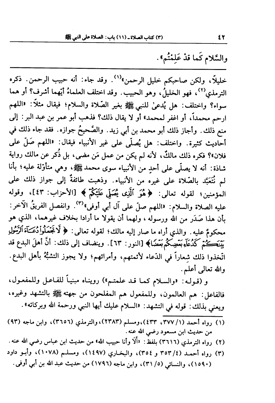 وقوله والسلام كما قد علمتم رويناه مبنيًا للفاعل وللمفعول، فالفاعل: هم العالمون، وللمفعول هم المُعَلَّمون من جهته - صلى الله عليه وسلم - بالتشهد وغيره، ويعني بذلك: قوله في التشهد السلام عليك أيها النبي ورحمة الله وبركاته.