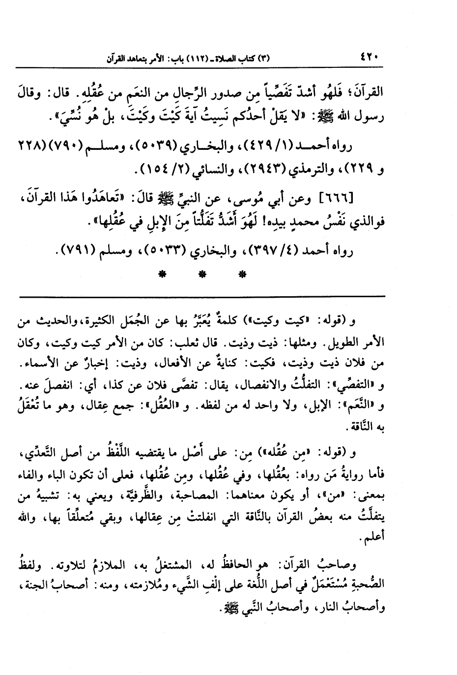 القُرآنَ؛ فَلَهُوَ أَشَدُّ تَفَصِّيًا مِن صُدُورِ الرِّجَالِ مِنَ النَّعَمِ مِن عُقُلِهِ. قَالَ: وَقَالَ رَسُولُ اللهِ - صلى الله عليه وسلم -: لا يَقُل أَحَدُكُم نَسِيتُ آيَةَ كَيتَ وَكَيتَ، بَل هُوَ نُسِّيَ.